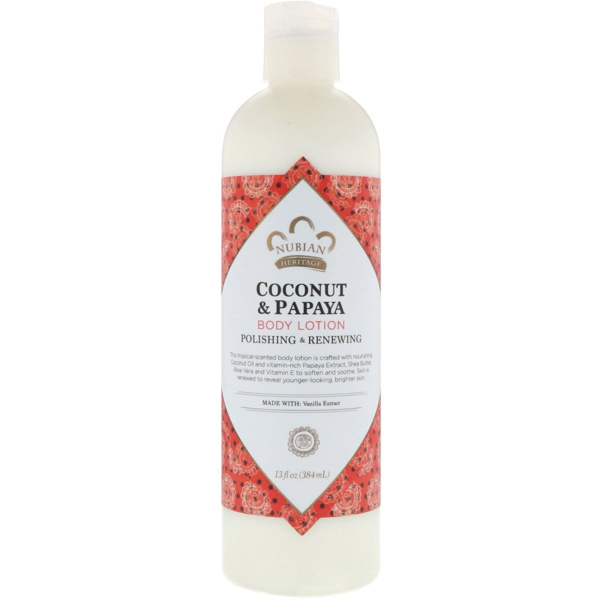Polishing & Renewing Made With: Vanilla Extract Certified B Corporation Cruelty Free Ethically Traded Ingredients Sustainably Produced No Animal Testing This tropical-scented body lotion is crafted with nourishing Coconut Oil and vitamin-rich Papaya Extract, Shea Butter, Aloe Vera and Vitamin E to soften and soothe. Skin is renewed to reveal younger-looking, brighter skin. Humble Beginnings Nubian Heritage is the brainchild of two New York street vendors. In 1992, fresh out of college and without jobs, Rich and Nyema embarked on a mission to produce luxurious natural products from traditional African recipes with fair trade ingredients. Today Nubian Heritage offers culturally authentic natural products inspired by global ancient healing philosophies. Although Nubian Heritage products are no longer made in bath tubs, little else has changed; the company still makes its own products, still uses fair trade ingredients and still invests in community commerce. Heritage Since ancient times, the coconut tree has been a vital source of food and nourishment for millions of tropical communities in South America, Asia, the Caribbean and Africa. Coconut Oil is a valued natural cleanser and moisturizer. Papaya has a long history of being revered for its skin rejuvenating properties, our package symbolizes the sun and is typical of prints and textiles from the Caribbean which feature elaborate geometric designs made in a reverse applique process.