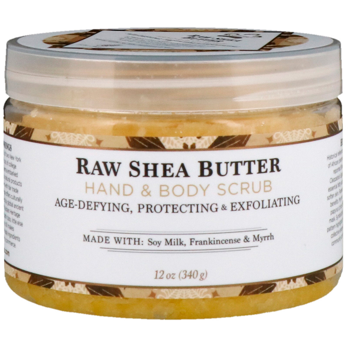 Age-Defying, Protecting & Exfoliating Made With: Soy, Milk, Frankincense & Myrrh Ethically Traded Ingredients Sustainably Produced No Animal Testing Certified B Corporation Cruelty Free A fragrant ultra-moisturizing sugar scrub with Shea Butter, nourishing Frankincense and Myrrh hydrates and exfoliates to reveal healthier looking, smoother skin. Heritage Historical references to Shea Butter, a staple of African pharmacology, date back to the reported Shea Butter caravans of Cleopatra's Egypt. Shea Butter is rich in essential fatty acids, which moisturize and soften skin. Frankincense has aromatherapy benefits. Myrrh dates back to an Ebers papyrus (circa 1580) recipe for a facial mask. Symbolizing growth, this package pattern highlights the shea nut, a symbol of collective empowerment through our community commerce supply chain. Humble Beginnings Nubian Heritage is the brainchild of two New York street vendors. In 1992, fresh out of college and without jobs, Rich and Nyema embarked on a mission to produce luxurious natural products from traditional African recipes with fair trade ingredients. Today Nubian Heritage offers hundreds of culturally authentic natural products inspired by global ancient healing philosophies. Although Nubian Heritage products are no longer made in bath tubs, little else has changed; the company still makes its own products, still uses fair trade and organic ingredients and still invests in community commerce.