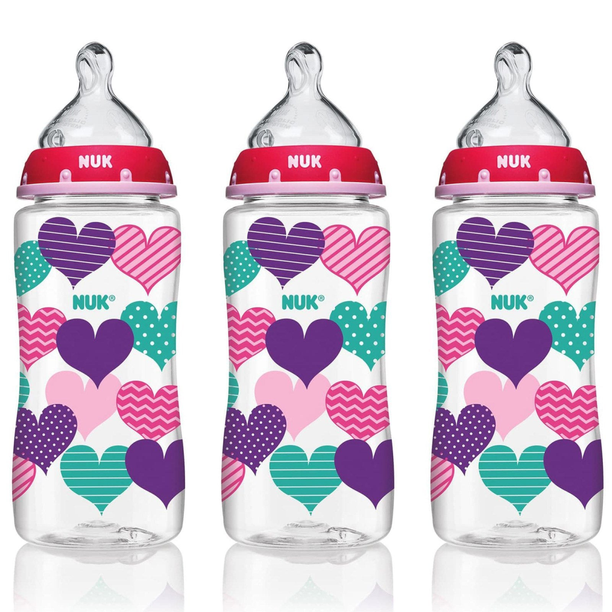 Natural Way to Feed Your Growing Baby 0+ Months Medium Flow Silicone Anti-Colic Air System 9/10 Babies Accept* Same Shape As Mom's Nursing Nipple For The Perfect Fit BPA Free During breastfeeding, mom's nipple changes shape and becomes the same shape as the Perfect Fit Nipple. Provides the Perfect Fit in baby's mouth. Before Breastfeeding During Breastfeeding Perfect Fit Nipple Perfect Fit Nipple features Soft Zone and the NUK Anti-Colic Air System that helps reduce colic, gas and spit-up. Soft Zone - Provides greater comfort as soft satin-like finish conforms to baby's palate. Anti-Colic Air System - 1-piece vent integrated into nipple - no extra parts to clean. Anti-Colic Air System allows baby to swallow liquid instead of air for a comfortable feed. NUK Bottles have a wide neck so they are easy to use and easy to clean. Optimally sized to support baby's growing mouth and appetite - available in 2 nipple sizes & 3 flow rates. Size 1 - Smaller nipple sized for babies 0-6 months. Slow flow & Medium flow. Size 2 - Larger nipple sized for babies 6+ months. Fast flow. NUK. You've Got This. For 60+ years, helping prepare Moms for their baby's changes with expertly engineered secret weapons. Also Try: NUK Learner Cups Help ease transition from bottle to cup with soft spout. NUK Orthodontic Pacifiers Soothes and calms baby better†Truly orthodontic shape naturally fits baby's mouth just like NUK Perfect Fit Nipples. †Based on market research, June 2013, tested with 110 NUK pacifier users. * Based on Market Research, June 2010, tested with 200 NUK Bottle users.