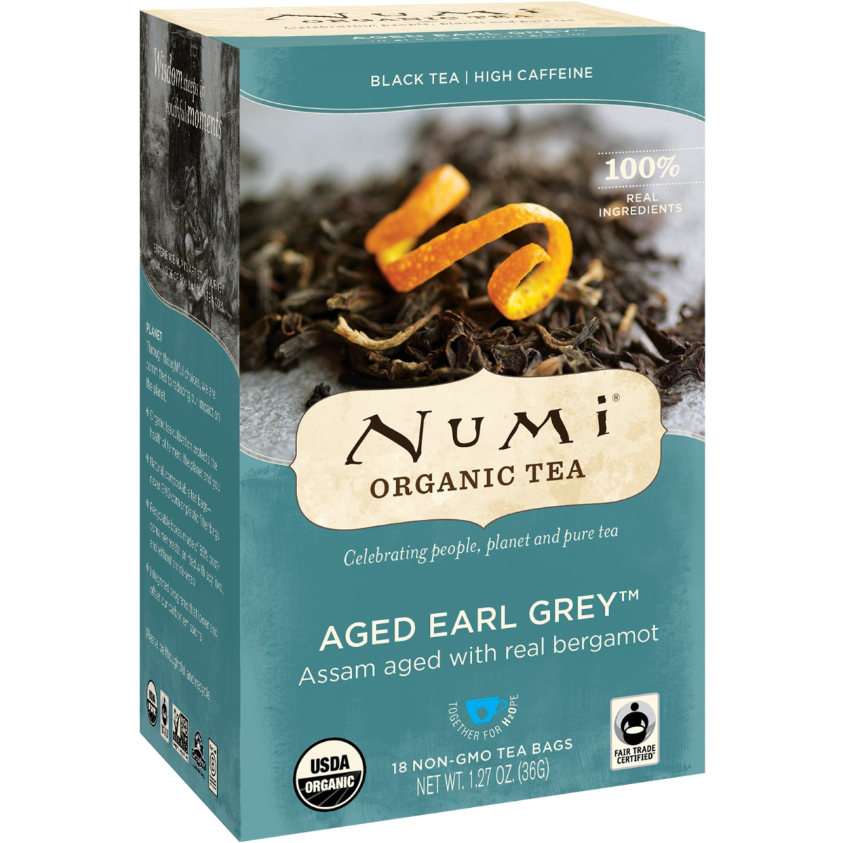 High Caffeine 100% Real Ingredients Celebrating People, Planet and Pure Tea Assam Aged with Real Bergamot Together for H2Ope Non-GMO Tea Bags USDA Fair Trade Certified Premium Teas & Herbs Real Fruits, Flowers & Spices No "Natural" Flavors or Fragrances Certified by QAI Non GMO Project Carbon Free Certified B Corporation Aged Earl Grey We age Assam black tea with real Italian Bergamot for several weeks so the tea absorbs the orange scent. Enjoy a robust Earl Grey with subtle citrus notes. Wisdom steeps in youthful moments. Planet Through thoughtful choices, we are committed to reducing our impact on the planet. tea cultivation protects the health of farmers, the planet and you Natural biodegradable filter-paper tea bags; not GMO corn or plastic see-through bags Recyclable boxes made of 85% post-consumer waste, printed with soy-based inks and without unneeded shrink-wrap Programs that lower and offset our carbon emissions including a solar-powered production facility