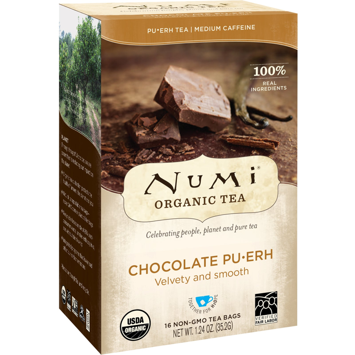 Medium Caffeine 100% Real Ingredients Celebrating People, Planet and Pure Tea Velvety and Smooth Together for H2Ope Non-GMO Tea Bags USDA Verified Fair Labor Certified by QAI Non GMO Project Carbon Free Certified B Corporation Traditionally known to: Help weight management** Improve digestion & metabolism Naturally boost energy **Along with a healthy diet and exercise. What's Pu•Erh? Pu•erh (pū-er) is an ancient healing tea picked from 500 year old wild tea trees in Yunnan, China. Pu•erh undergoes a unique fermentation process resulting in its rich earthy flavor and many health benefits that have been touted for thousands of years. Tea enthusiasts drink Pu•erh for its smooth taste and how it makes them feel. Chocolate Pu•Erh This velvety infusion combines black Pu•erh tea and cocoa. Accented by whole vanilla beans and sweet orange peel, this decadent blend is rounded off with a nutmeg and cinnamon finish. Planet Through thoughtful choices, we are committed to reducing our impact on the planet. tea cultivation protects the health of farmers, the planet and you Natural biodegradable filter-paper tea bags; not GMO corn or plastic see-through bags Recyclable boxes made of 85% post-consumer waste, printed with soy-based inks and without unneeded shrink-wrap Programs that lower and offset our carbon emissions including a solar-powered production facility