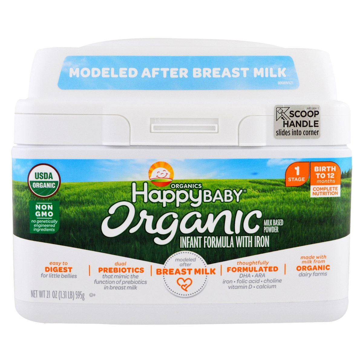 Modeled After Breast Milk Scoop Handle - Slides into Corner USDA Non GMO Complete Nutrition Milk Based Powder Easy to Digest for Little Bellies Dual Preobiotics that Mimic the Function of Prebiotics in Breast Milk Modeled After Breast Milk Thoughtfully Formulated | DHA – ARA, Iron, Folic Acid, Choline, Vitamin D, Calcium Made with Milk from Dairy Farms Certified by Quality Assurance International Gluten Free Breast Milk is the optical way to nourish your baby and we encourage breastfeeding when possible. However, we know every parent’s journey is different and breastfeeding is not always an option. That’s why we carefully modeled our infant formula after breast milk’s unique composition. We are proud to provide families with this nutritionally complete, USDA certified infant formula. Before using an infant formula, ask the advice of your healthcare professional. Powdered infant formulas are not sterile and should not be fed to premature infants or infants who might have immune problems unless directed and supervised by your baby’s doctor. Formulated with Love, Modeled after Breast Milk. As moms, we know that everyone’s feedings journey is different, yet the goal is always the same: give your baby the best nourishment possible. Breast milk offers the ideal nutrition for babies, and we encourage breastfeeding as the best option. But when it’s not possible, you can confidently nourish your baby with alternative. Made with carefully selected, quality ingredients, our HappyBaby Infant formula is thoughtfully balanced to help support your little one (and you) during this precious time. Dual Prebiotics Non-GMO* No Corn Syrup Solids Milk from Cows Raised on Farms *no genetically engineered ingredients Modeled after Breast Milk Prebiotics – Prebiotics** are found in breast milk and help to develop baby’s immunity and digestive health. We include both GOS and FOS, prebiotics that mimic the function of those found in breast milk in our formula. Lactose – As with breast milk, lactose is the most prominent carbohydrate in our formula, and helps contribute to baby’s energy. Complete Nutrition – Our formula features a unique blend of vitamins for your growing baby, modeled after the composition of breast milk. **Human milk oligosaccharides act as a prebiotics in breast milk, GOS=milk-based prebiotic, FOS= plant-based prebiotic