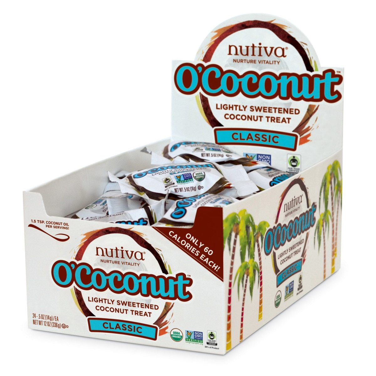 Nurture Vitality USDA Organic Non-GMO Project Verified Fair Trade Certified Coconut (38% of Product) No Corn, Soy or Cane Sugar Only 60 Calories Each! Revolutionizing the Way the World Eats Vegan Non-GMO 60 Calories Each Certified Organic by QAI and Ecocert ICO Fair Trade Certified by Fair Trade USA Certified B Corporation Made from pure, organic coconut, Nutiva's O' Coconut Classic is a delicious lightly sweetened treat with no corn, soy or cane sugar. It’s the perfect on-the-go snack with the added benefit of medium chain triglycerides.