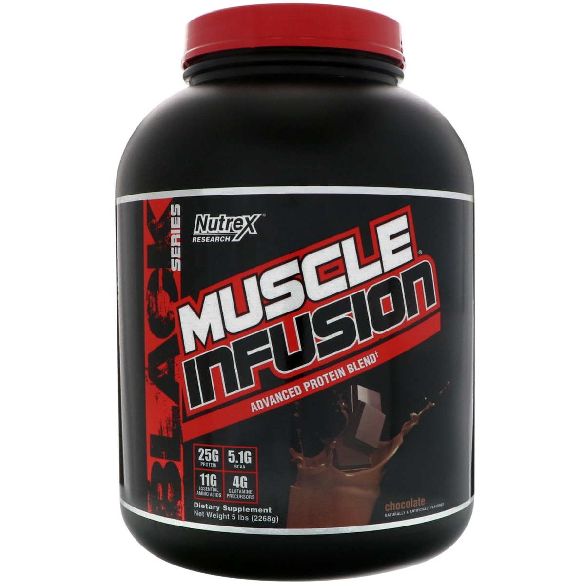 Black Series Nutrex Research Advanced Protein Blend 25 g Protein 5.1 g BCAA 11 g Essential Amino Acids 4 g Glutamine Precursors Dietary Supplement Naturally & Artificially Flavored Muscle Infusion Product Highlights 25 Grams of Protein Per Serving Packed with 5 Different Proteins Provides Whey Protein Concentrates & Isolates High in Essential Amino Acids High in Natural BCAAs Low in Fat Instantized: Mixes Easily With a Spoon Tastes Absolutely Delicious Muscle Infusion is an advanced multi-protein formula supplying your muscles with 25 grams of high-quality protein per serving. Rather than just focusing on a single source Muscle Infusion is packed with five different proteins. Muscle Infusion is high in essential amino acids which are the true building blocks of muscle. It's a great glutamine source and with its naturally occurring high level of BCAAs it helps fuel muscle repair and growth. To support your quest for lean muscles, Muscle Infusion is very low in fats. It tastes absolutely delicious and mixes easily with a spoon.