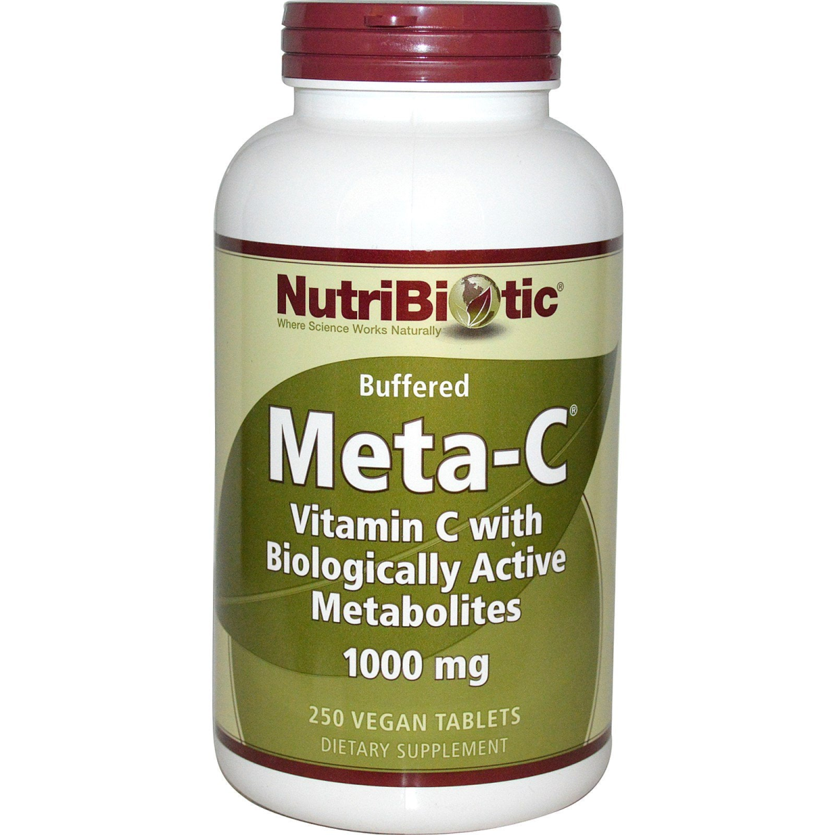 Where Science Works Naturally Buffered Vitamin C with Biologically Active Metabolites Dietary Supplement Naturally Fresh Nitro Pak Bacteria Free Environment Rapid Absorption NutriBiotic Meta-C is a unique, buffered vitamin C that absorbs faster and more efficiently than regular vitamin C with no intestinal discomfort. Meta-C i water-processed at low temperatures with calcium, resulting in high solubility and bioavailability with an alkaline pH similar to blood. Natural processing conjugates vitamin C with an array of biologically active metabolites in a buffered form as a fully reacted ascorbate of calcium. This calcium ascorbate is then reacted with spirulina (blue-green algae) creating an advanced food-bound nutrient system providing all the properties found in concentrated whole foods such as protein, lipids, glycoproteins, lipoproteins, nucleoproteins (RNA/DNA), complex carbohydrates, phytopigments, flavonoids, fatty acids, enzymes, co-enzymes, trace elements, and fiber.
