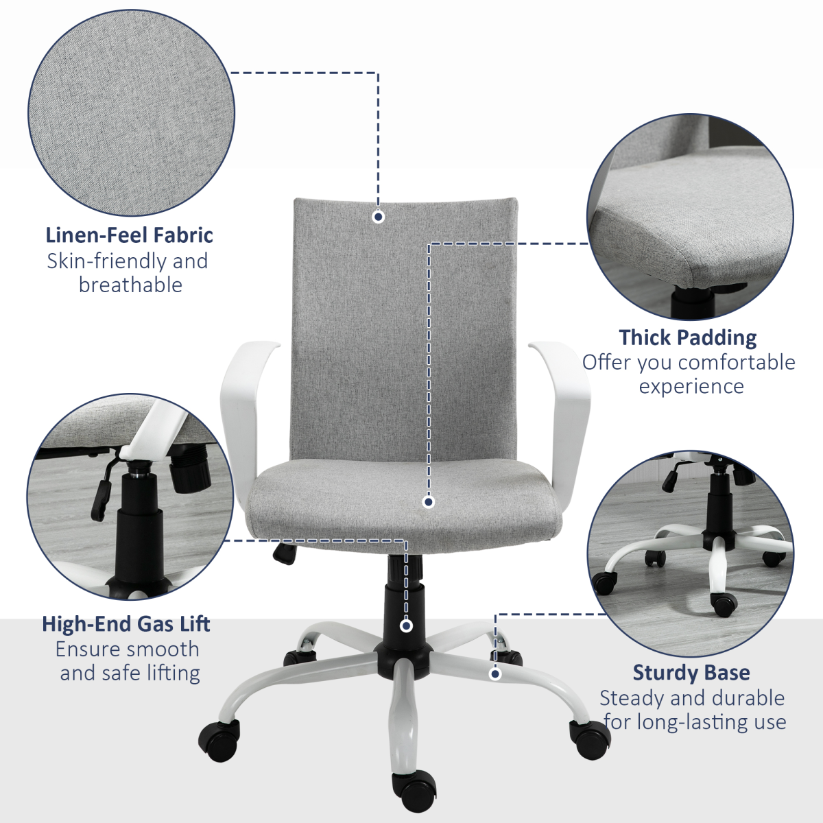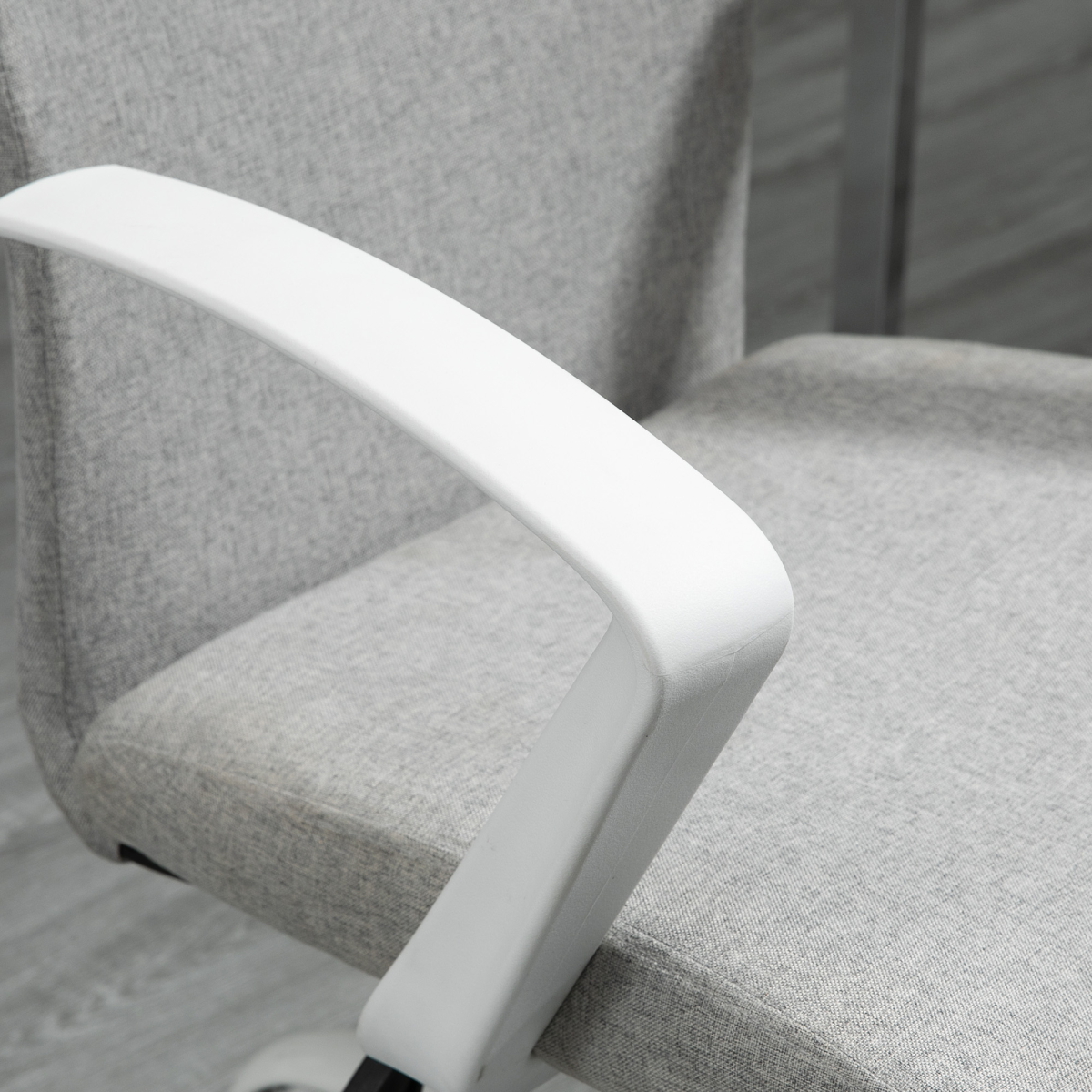 - Office Chair Linen Swivel Computer Desk Chair Home Study Task Chair, Light Grey - Description: - 89-99cm adjustable height: Adjust this desk chair to a position best for you, controlled by the gas lift for smooth movement. - Ergonomic: PC chair features a 360° swivel seat, two fixed armrests, a tall back and five wheels on the base. Works with your body, supporting it whilst seated. - Comfortable office chair: Padded seat and linen-look upholstery makes it easy to sit on this home office chair for long periods. - Five wheels: Attached to the base of this computer chair - easy to move it around. - Dimensions: 89-99H x 61W x 61Dcm. Seat: 47-57H x 48W x 44Dcm. Maximum load 120kg. Assembly required.