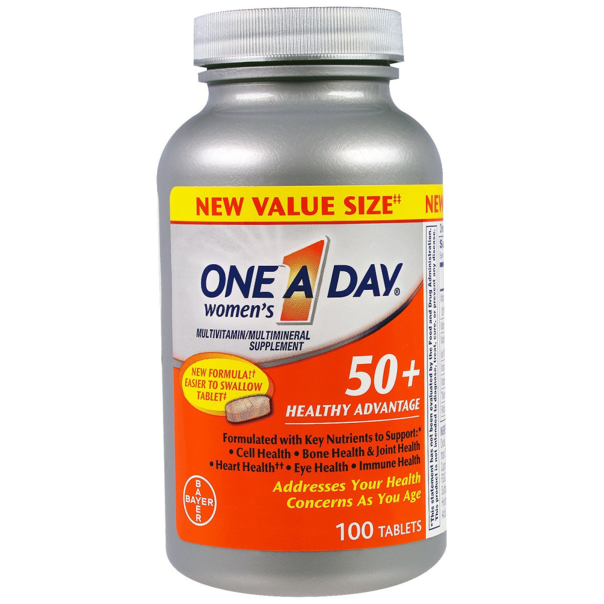 New Value Size‡‡ Multivitamin/Multimineral Supplement New Formula!†Easier to Swallow Tablet‡ Addresses Your Health Concerns As You Age Formulated with Key Nutrients to Support: Cell Health Bone Health & Joint Health Heart Health††Eye Health Immune Health †300 mg of Calcium compared to 500 mg of Calcium in previous One A Day Women's 50+ Healthy Advantage formula. ‡25% smaller as compared to previous tablet. ‡‡ Compared to current One A Day Women's 50+ Healthy Advantage 65 ct. ††Not a replacement for heart medications.