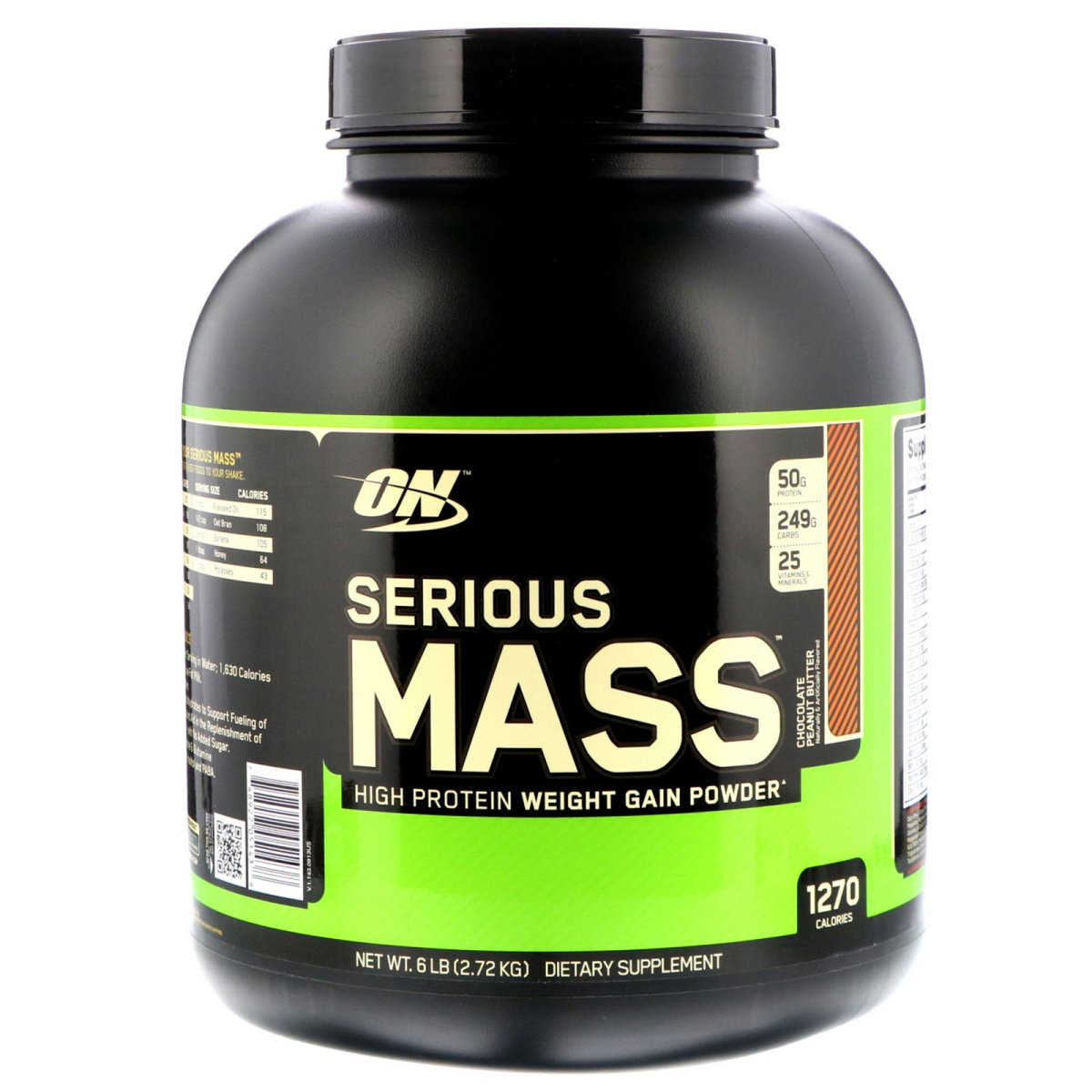 50 g Protein 249 g Carbs 25 Vitamins & Minerals Naturally & Artificially Flavored 1270 Calories Dietary Supplement True Strength The True Strength Of Weight Gainers Serious weight gain requires serious calories. However, those who need the extra calories most often have the toughest time consuming enough of them. For many aspiring to be bigger, a highly-active metabolism, weaker appetite and on-the-run lifestyle can make it a real challenge to consume enough calories through whole foods alone. With Serious Mass, you've got nothing to lose and lots to gain. We've consolidated 1,270 calories, 50 grams of protein, 249 grams of carbohydrates, 25 vitamins & Minerals, glutamine and creatine into every serving. It's time to stop thinking small; get serious - Serious Mass. Supercharge Your Serious Mass By adding one or more of these foods to your shake. Serving SizeCaloriesServing SizeCalories 1/2 cupGranola2501 tbspFlaxseed Oil115 1/4 cupChocolate Chips1981/2 cupOat Bran108 2 tbsp.Peanut Butter1901 smallBanana105 1 oz.Almonds1671 tbsp.Honey64 1 oz.Peanuts1641 tbsp.Molasses43 1/2 cupIce Cream160 1 cupWhole Milk150 1/2 cupCoconut139 Beyond The Basics 1,270 Calories per Serving in Water; 1,630 Calories When Made with Low Fat Milk. 50 Grams of Protein 249 Grams of Carbohydrates to Support Fueling of Intense Workouts and Aid in the Replenishment of Glycogen Stores - with No Added Sugar. Creatine, L-Glutamine & Glutamine Peptides, Choline, Inositol and PABA.