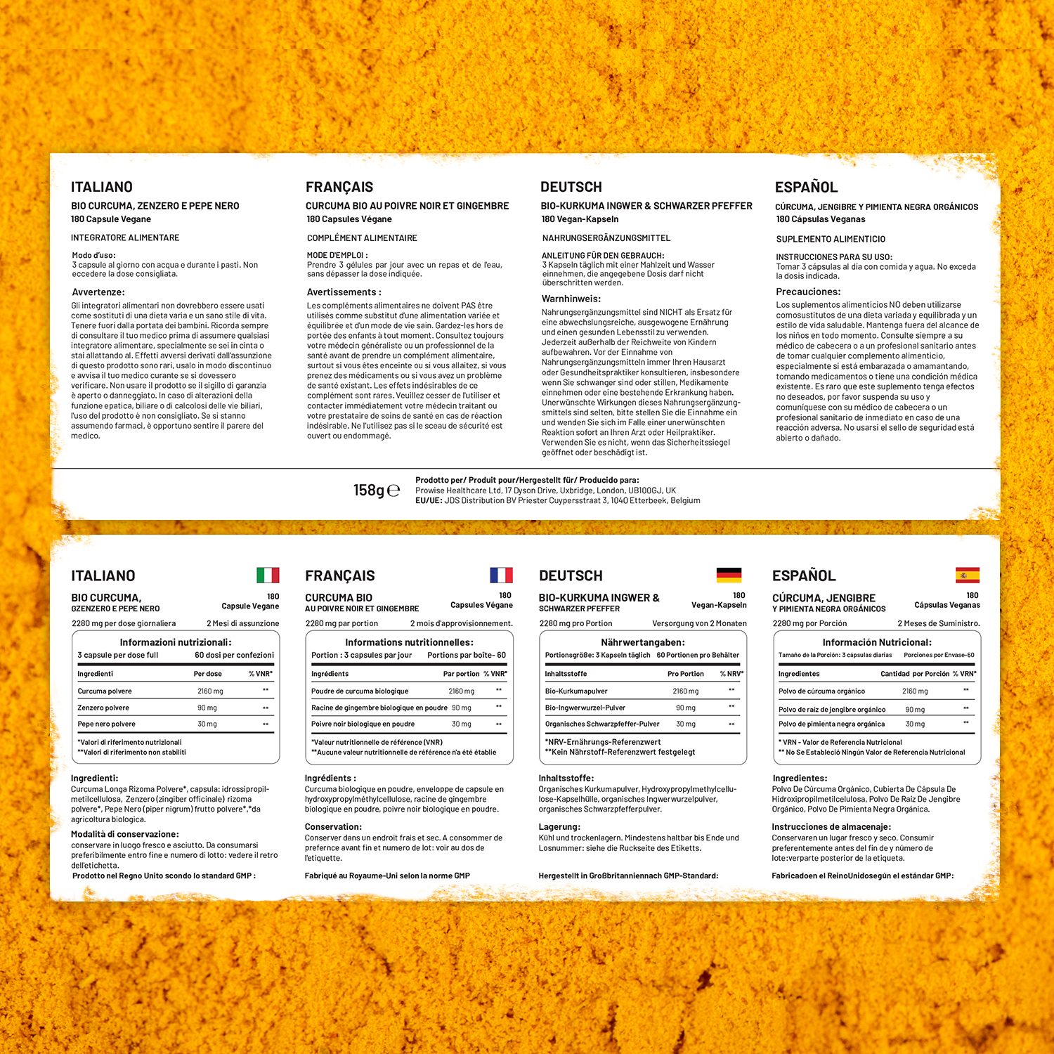 Prowise Turmeric capsules high strength have been formulated to provide with 2280mg daily serving (3 capsules) of our Turmeric contains: 2160mg of Organic Turmeric (720mg per capsule), 90mg of Ginger (30mg per capsule), and 30mg of Black Pepper (10mg per capsule)