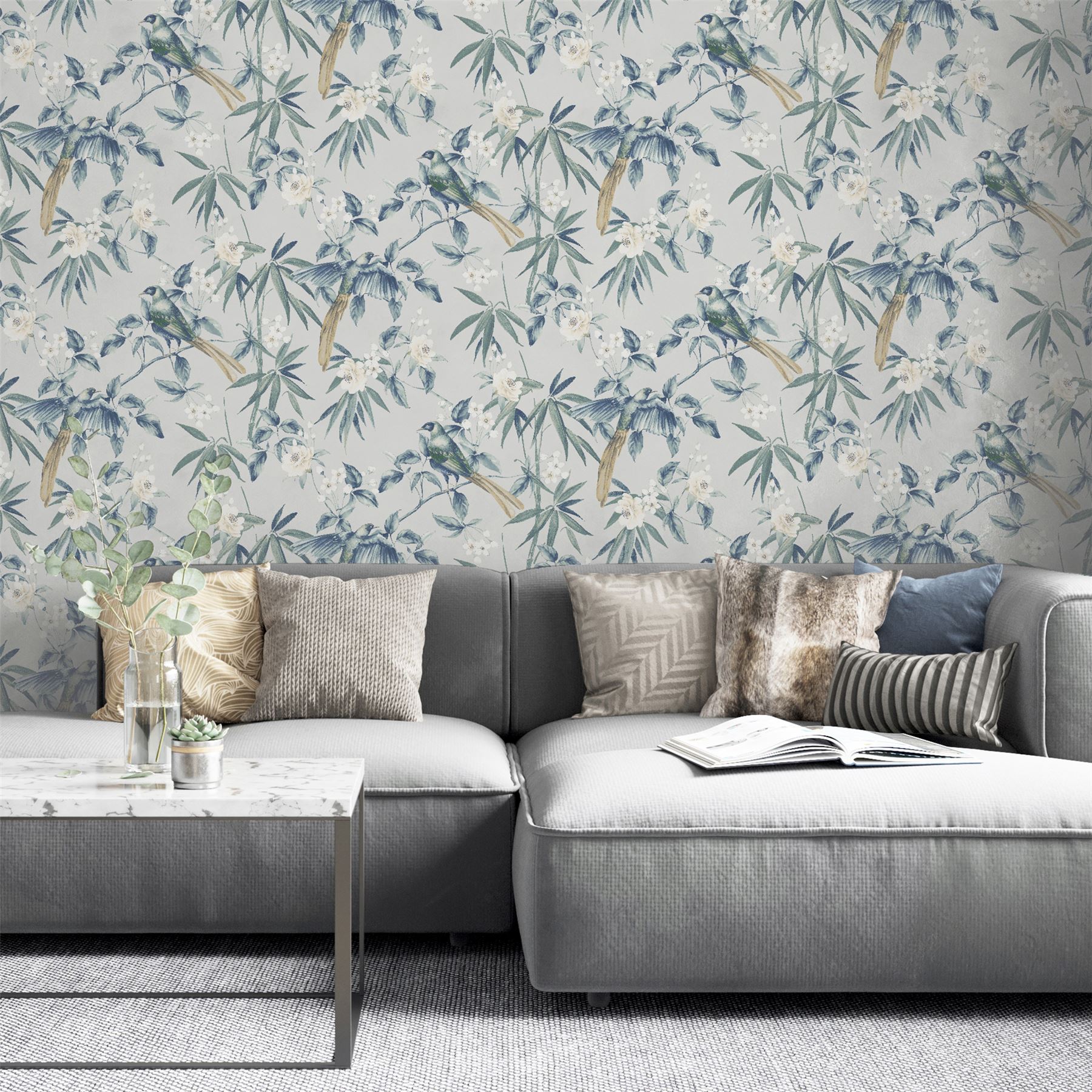 This Oriental Floral wallpaper design is the perfect combination for adding a delicate and natural look within any room of your home. This design features beautiful blossom flowers intertwined with bamboo-like plants, which has gorgeous birds perched on or in flight. A lovely wallpaper in a modern blue and grey colourway that will look great when used to decorate a whole room or to create a feature wall.