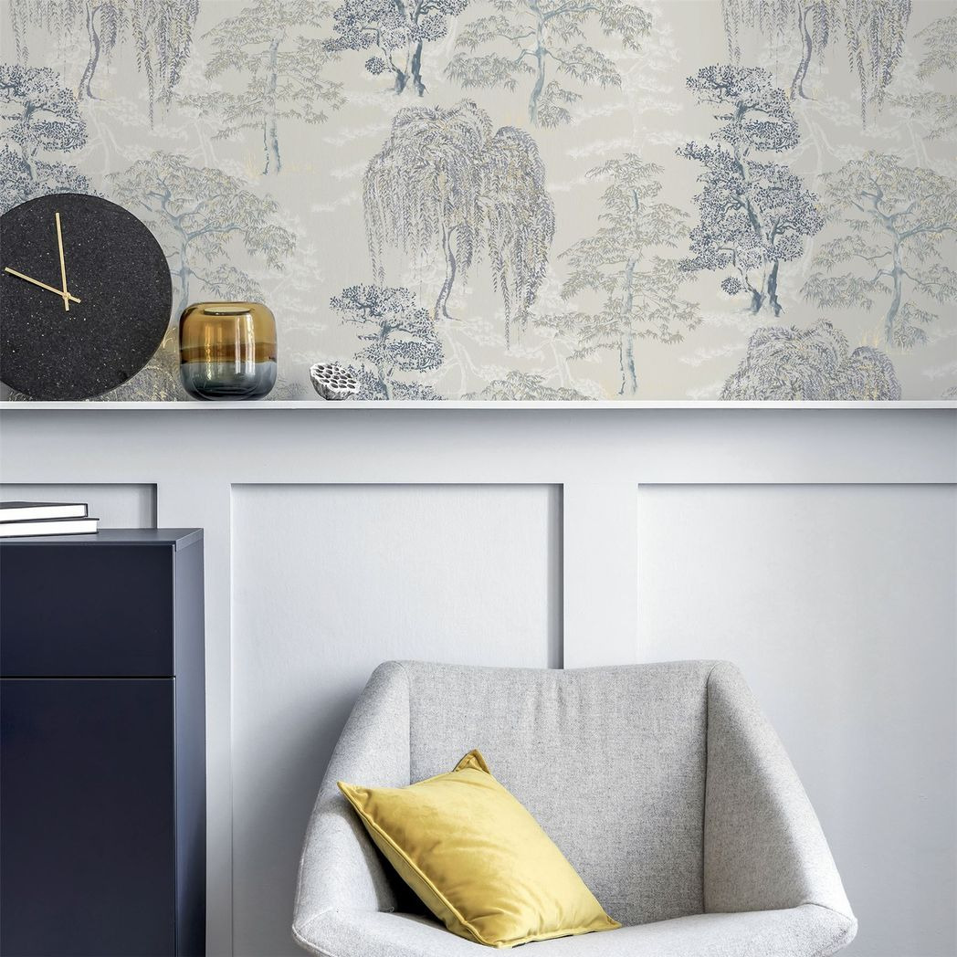 This stunning wallpaper features gorgeous trees that resemble an oriental garden. The soft blue colourway of this wallpaper is subtle enough to use throughout a room, or to pick out as feature wall, for a cool, contemporary look.
