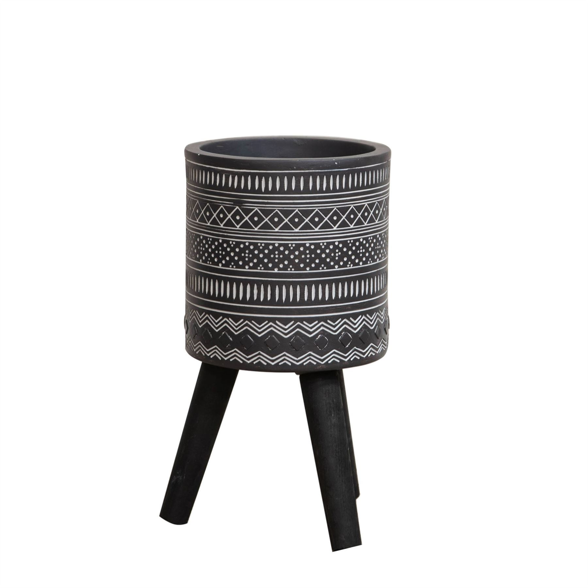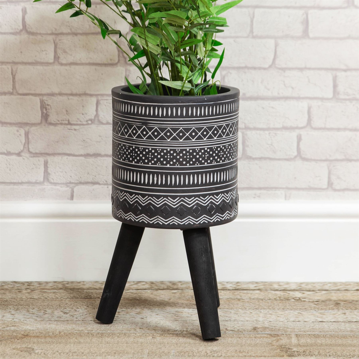 Bring some colour and life to your home or garden with this exotic patterned black fibre clay planter. From Country Living - gift and home bringing you closer to the great outdoors. Details: - H:40.5cm x W:23.5cm - Weather resistant fibre clay planter - Matt black finish with inlaid white patterns - 3 x black wooden legs - Suitable for indoor or outdoor use - Legs require assembly - Recommended to use an inner pot The perfect accessory for an exotic African insipred home decor style.