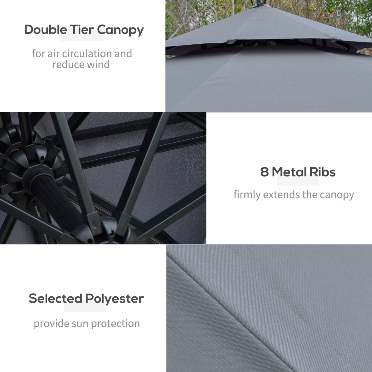 SOLAR POWERED LED LIGHTS: Fitted on the support ribs of this garden umbrella, they illuminate your garden beautifully at night, extending your time outdoors.OFFSET CANTILEVER UMBRELLA: This dark blue square offset cantilever umbrella can cover large patio furniture that doesn't have a hole to mount a standard umbrella to. Use it to cover outdoor sectionals, pool lounge chairs, or patio dining sets to provide comfortable shade even in difficult situations.CRANK HANDLE: Open and close the patio umbrella quickly and easily - start enjoying outdoors with protection almost instantly.METALeFRAME: Tough structure core structure, cantilever umbrella stands steady. Eight ribs support the canopy. CROSS BASE INCLUDED: Additional weights for this LED parasol are required but not included (Suggested weight: over 130kg).DIMENSIONS: 230H x e295cm. Pole: e48mm. Note: Do not use in inclement weather and put away the banana umbrella.