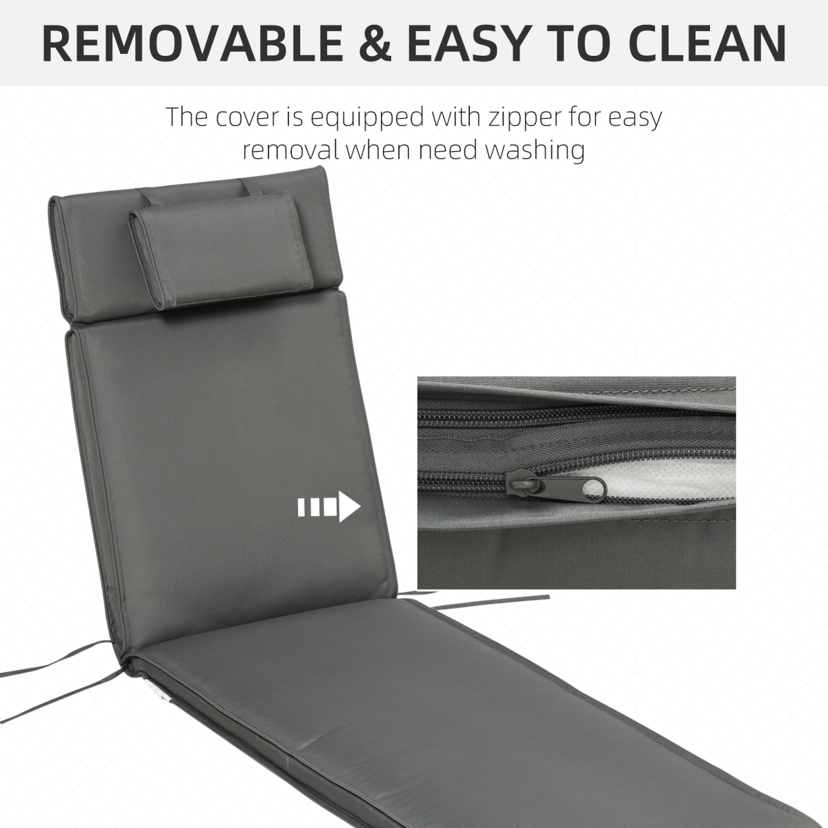 COMFORTABLE LOUNGE CUSHION: Breathable polyester cover and high-density filling, bring you a more comfortable and relax able seating experience with this outdoor bench cushion.SIDE TIES: Four tie fastenings keep the bench seat cushion securely fastened to your outdoor patio furniture and avoid it slipping out of place.HEAD PILLOW: This garden bench seat pad with a removable pillow, provides support and extra comfort. Suitable for most sunbathing or garden chairs.DOUBLE-STITCHED CONSTRUCTION: Double-stitched seams ensure strength under stress while piping adds a sophisticated look, making the garden bench cushion looks great in any setting.EASY CLEAN: Zips on cover so it can be easily removed and washed. DIMENSIONS: 198Lx53Wx5Tcm. FITS MOST LOUNGE CHAIRS.