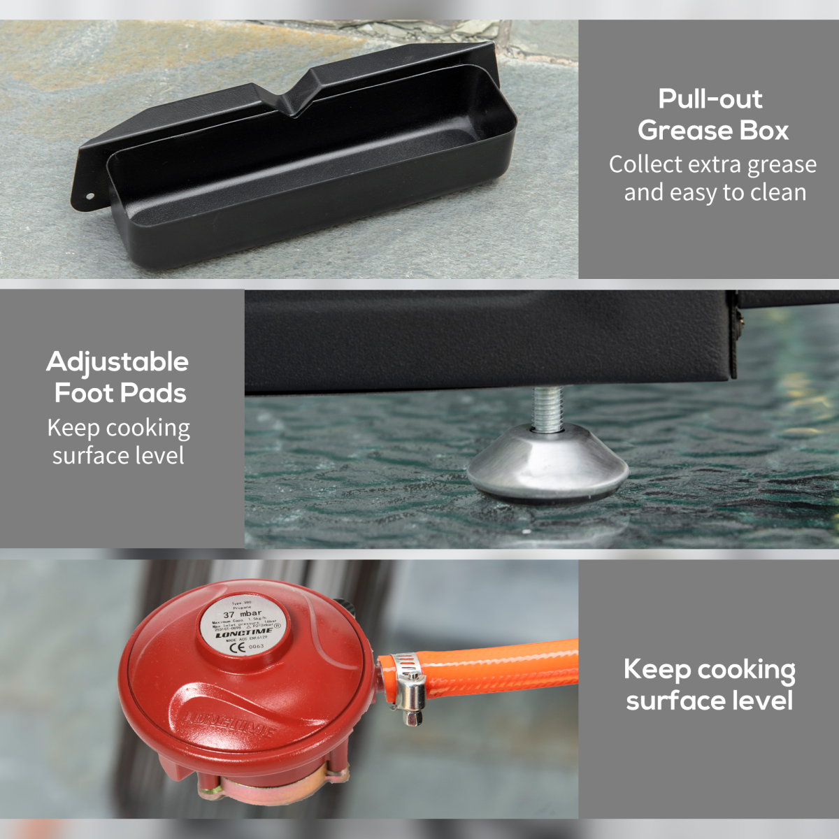 Three 10000 BTU burners - three cooking areas: A plancha grill which can cook three different types of food at three different temperatures. Gas plancha caters for small and large meals - no wasted heat space if cooking in just one areNon-stick hotplate: Gas bbq plancha has an enamel-coated plate, making it easy to cook food and clean after.Compact: This portable gas bbq is perfect for taking with you on-the-go - whether to BBQs, festivals and more.Drain hole and grease collection box: Cooking grease collects together. Pull the box out to empty, saving you time.Dimensions: 61L x 48.5W x 21Hcm. Grill plate: 61L x 35.5Wcm. Regulator and hose included.