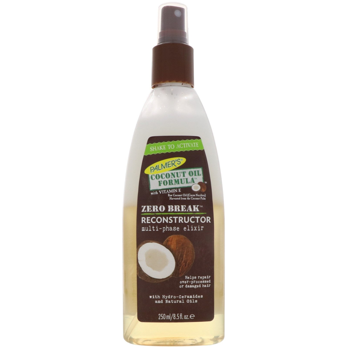 Shake to Activate With Vitamin E Raw Coconut Oil (Cocos Nucifera) Harvested from the Coconut Palm Multi-Phase Elixir Helps Repair Over-Processed or Damaged hair With Hydro-Ceramides and Natural Oils No Sulfates No Parabens No Phthalates No Mineral Oil No Gluten No Dyes Palmer's Is Against Animal Testing Family Owned & Operated Palmer's Coconut Oil Formula Zero Break Reconstructor blends Protective oils + Ceramide-infused cream for hair that is stronger and less prone to breakage. Multi-Phase Technology Hydro-Ceramides Reconstruct and Repair Hair Cuticle Extra Virgin Coconut Oil, Tahitian Monoi, Sweet Almond Oil, Sunflower Seed Oil & Natural Vitamin E