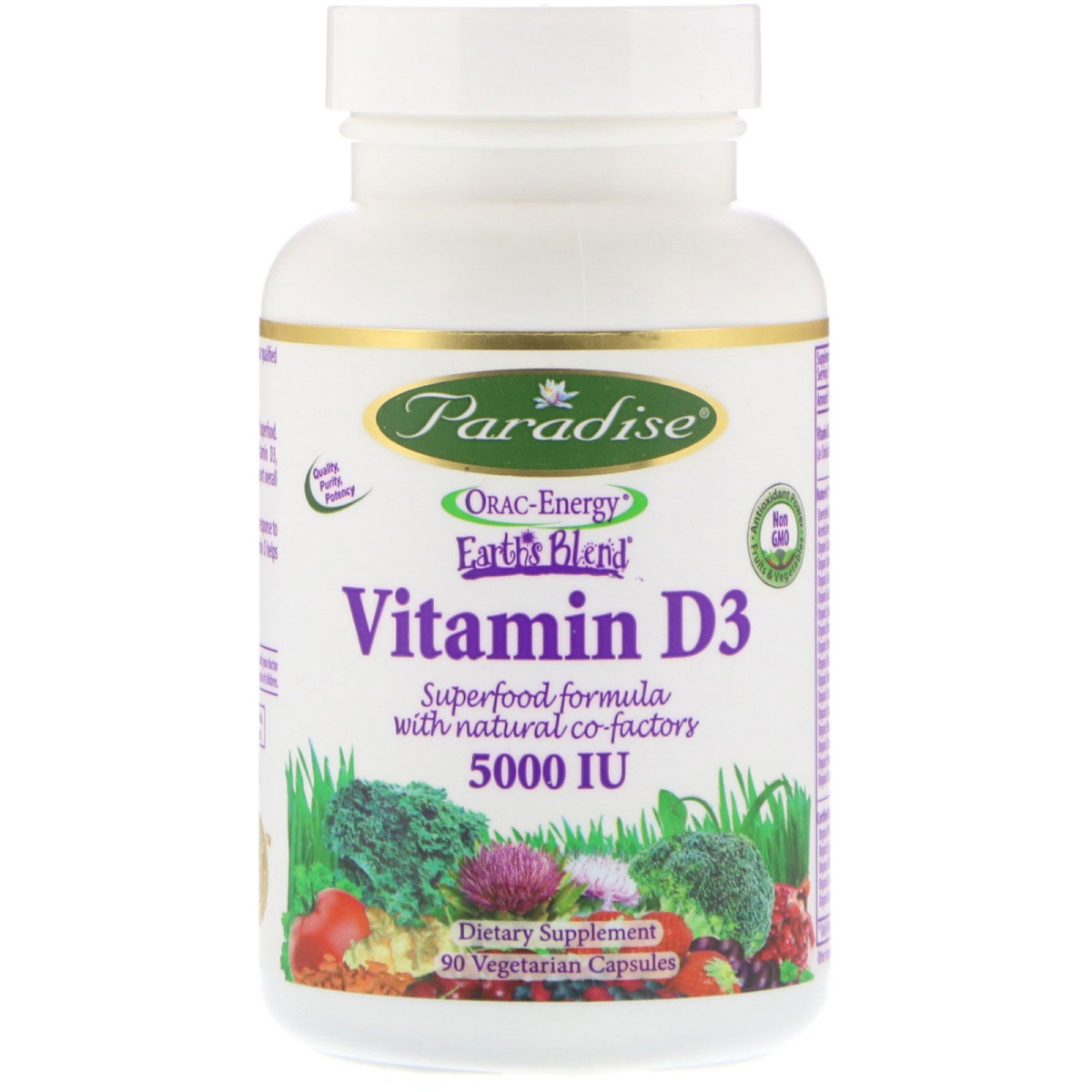 Energy + Vitality + Well-Being Antioxidant Powder - Non GMO - Fruit & Vegetables Superfood Formula with Natural Co-Factors Non-GMO, Gluten Free Dietary Supplement Enhancing Nature's Miracles Since 1994 Quality Supplements For Every Lifestyle Contains The Patented Original Greens Formula US Patent #7,923,044 B2 At Paradise we have spent years developing and perfecting products that retain the true essence and natural balance of nature in a form that is safe and effective for even the most sensitive of individuals. Our core philosophy is based on seven standard of excellence: Quality, Purity, Potency, Efficacy, Safety, Sustainably and Value. Our ongoing commitment and innovation for these standards is reflected in everything we do. Continually dedicated to sourcing and formulating premium, ultra pure products that meet the highest standards of excellence. Ultra Absorption + Highest Quality Unlike tablets contains binders, fillers, magnesium stearate or stearic acid (which may inhibit absorption), our vegetarian capsules dissolve quickly in the digestive tract. Nature Synergized with Real Whole-Food Goodness Paradise Earth's Blend Vitamin D3 is truly a Nature Synergized superfood. Our formula uses real whole-food goodness paired with vitamin D3, probiotics and herbs to go beyond mere deficiencies and help support overall whole system health. Vitamin D is normally produced in the body's skin by exposure and response to sunlight, which is why it is known as the sunshine vitamin. Vitamin D supports many essential health promoting functions. Total ORAC (Oxygen Radical Absorbance Capacity) Assay Recent technology has resulted in a comprehensive new testing method called the Total ORAC Assay. With the development of the Total ORAC test, it is now possible to target and measure the effects of superfoods, vitamins and antioxidants on the full range of major free radicals found in the body. Paradise affirms its commitment to innovation and leadership in the multivitamin, superfood and antioxidant category by delivering an award winning formula that supports overall whole system health.