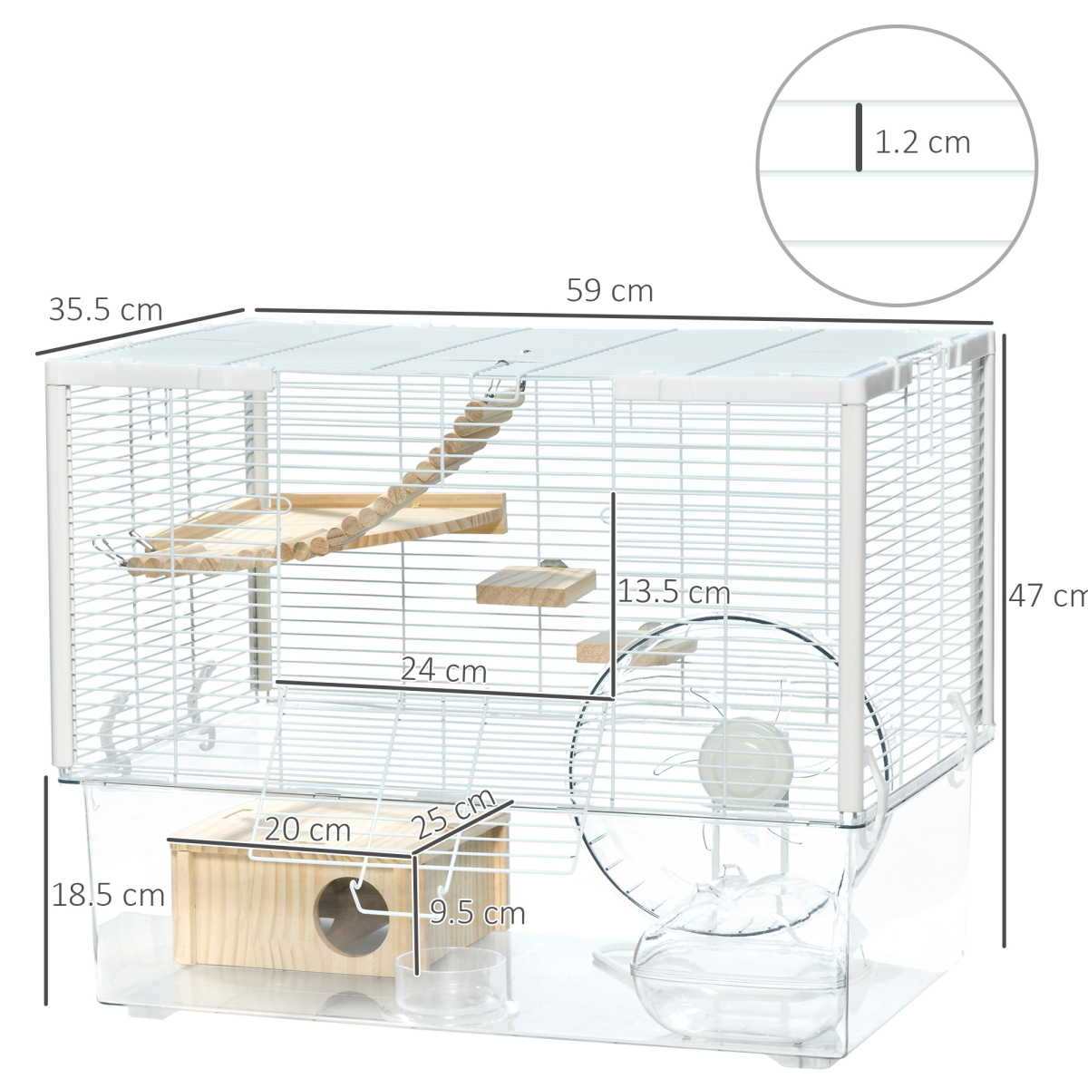 Three tiers: A spacious syrian hamster cage with ramps, platforms and an exercise wheel, keeping pets active. There is also a litter area and a food bowl, making sure pets have everything they need when inside this gerbil cage.Easy access: The front door for getting in and out, whilst the detachable bottom makes cleaning simple.Comfortable features: The steel wires keep pets safely inside the mice cage, whilst ensuring their space has air passing through for ventilation.Dimensions: 47H x 59L x 35.5Wcm. Suitable for small animals, such as smaller hamsters and gerbils. NOTE: Please check if pets can be mixed before buying.Assembly required.