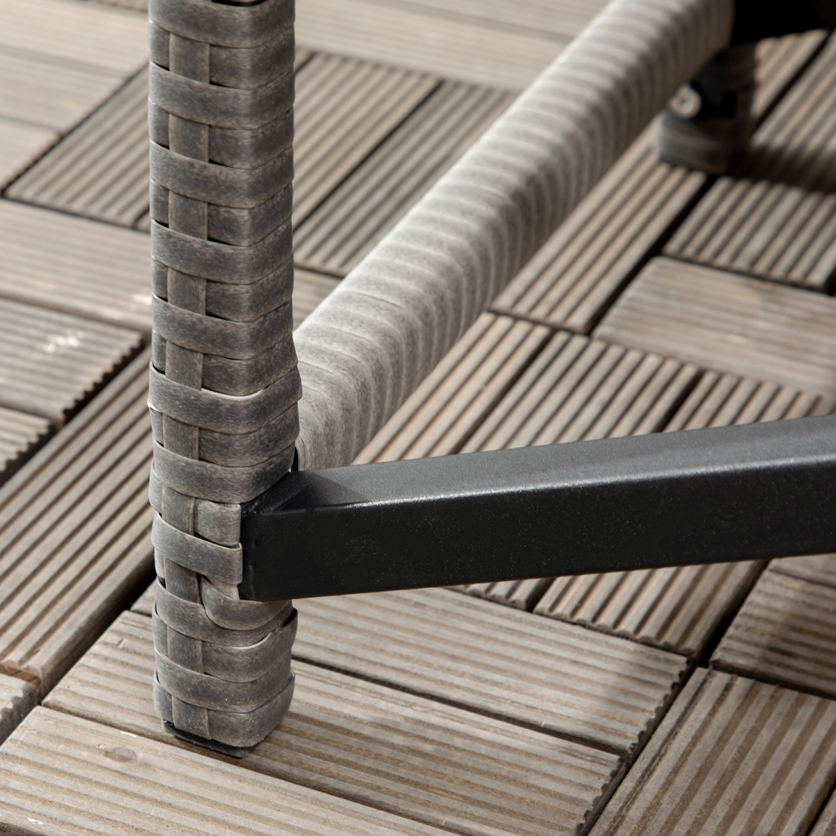 Simple rattan side table: Somewhere for your garden and outdoor areas. This rattan outdoor table gives a handy holding spot close by.Steel frame, rattan top: Powder coated metal for a strong structure. Plastic wicker top is durable - adds to the style of this garden side table.Spacious table top: Outdoor coffee table has a good amount of room for holding what you want to have close by - now moving once you're settled in.Four legs, with support: Balanced table, with 'X' shaped bars for extra support. Keeps the table stable.Dimensions: 43H x 80L x 40Wcm. Maximum load 30kg. Assembly required.