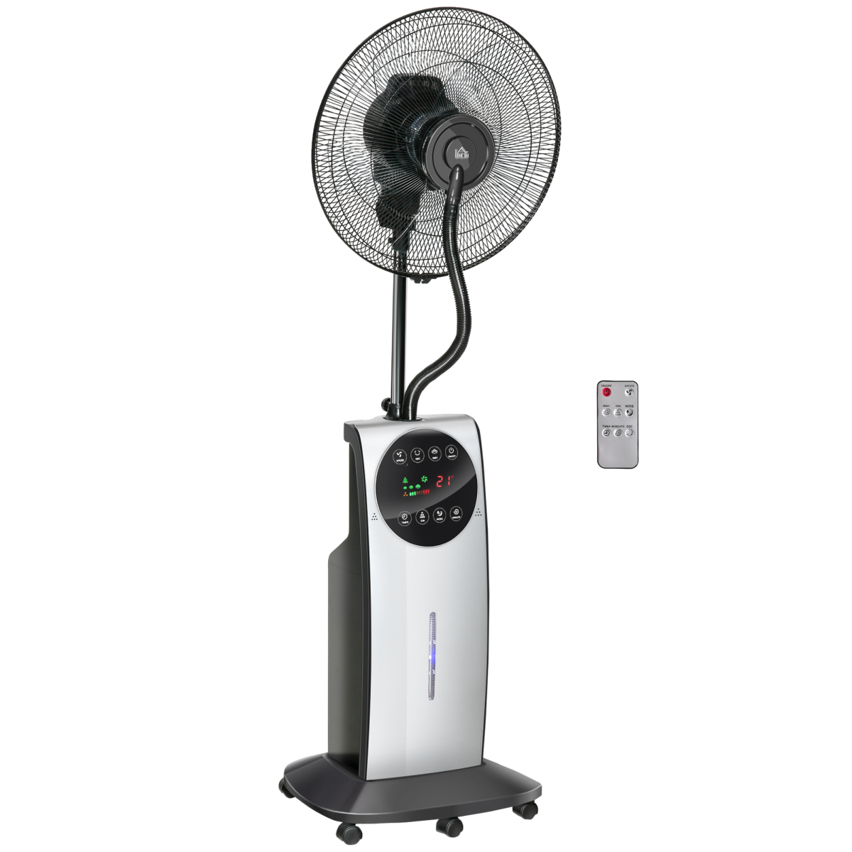 Comfortable water mist fan: The adjustable tilting head and switchable horizontal oscillation contribute to extensive cooling space. Also, you can add ice to the water tank so that you will get cooler refreshment.Three settings: The water spray fan switches between normal/natural/sleep modes, low/medium/high speeds and 220ml/h/250ml/h/280ml/h mist amounts to customize your cooling experience. You can control it either via buttons directly on the device or comfortably from afar via the remote control.Timer operation: Its built-in timer function allows you to set the floor fan with mist to run up to 12 hours. This is perfect if you do not want to leave the fan on for a whole night.Considerate design: Electric mosquito killing tablet jack and aromatherapy oil box on the back (mosquito killing tablet and aromatherapy not included) allows you to have a wonderful summer night without mosquito. The pedestal fan with water mist spray can be easily moved thanks to four wheels on the bottom.Dimensions: Overall Dimension: ?44.5 x 135Hcm. Assembly required.
