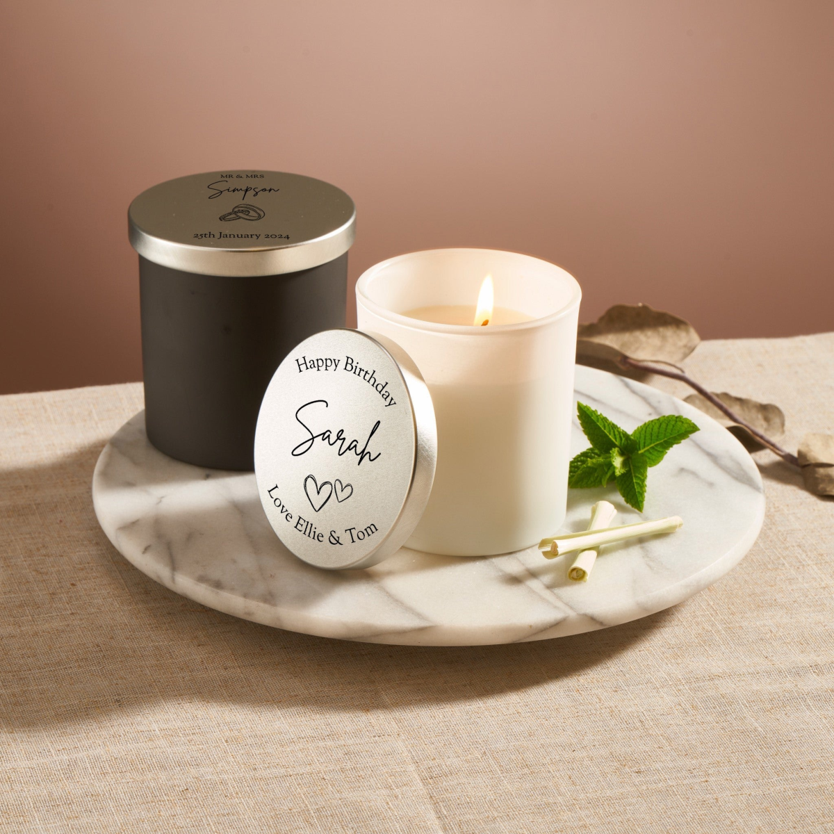 Illuminate your space with our Personalised Lemongrass & Mint Scented Soy Wax Candle, the perfect gift choice meticulously hand-poured to infuse warmth and elegance into any setting. Complete with a lid that can be personalised, crafted with vegan-friendly soy wax, it's a thoughtful touch for any occasion.