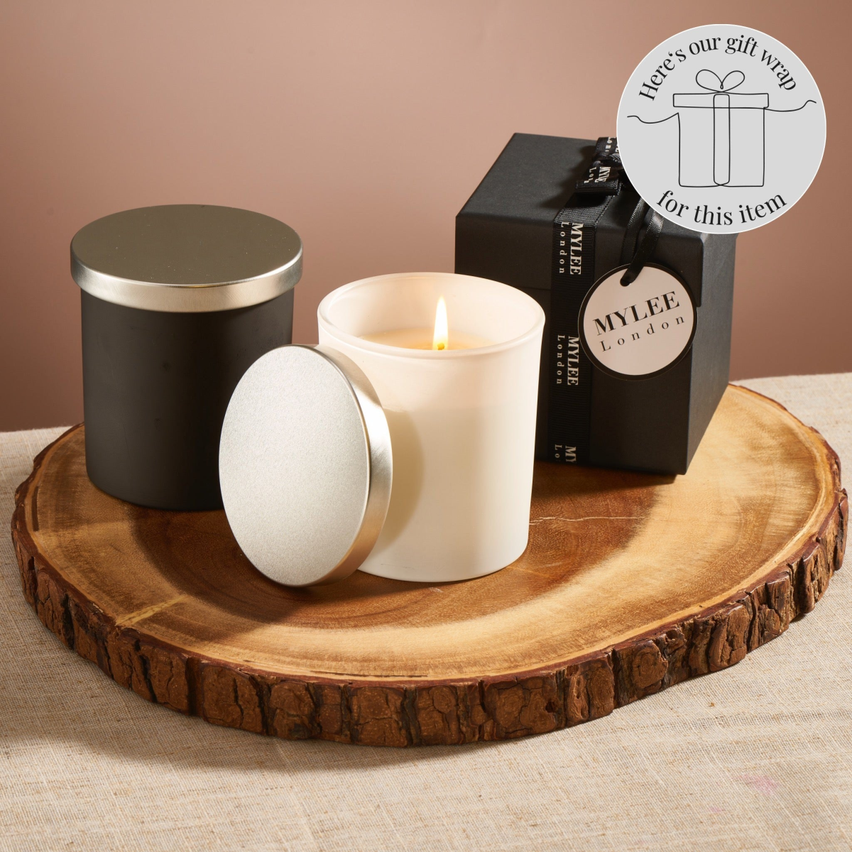 Housed in sleek black or white glass jars, our candles are exquisitely packaged and ready to impress. Each candle is sent in a cardboard box for secure shipping. Upgrade to our deluxe gift wrapping, which includes a black gift box, gift tag, and ribbon, for an added touch of sophistication.