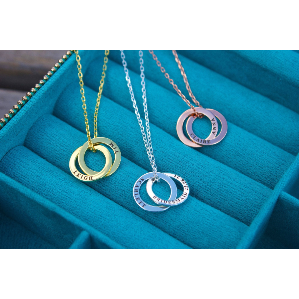 Make a statement with our stunning Personalised Double Ring Silver Necklace, featuring a beautiful interlocking ring design. This timeless piece, often referred to as a Russian ring necklace or circle pendant, is crafted from premium 925 Sterling Silver and offers custom engraving, making it the perfect personalised accessory.