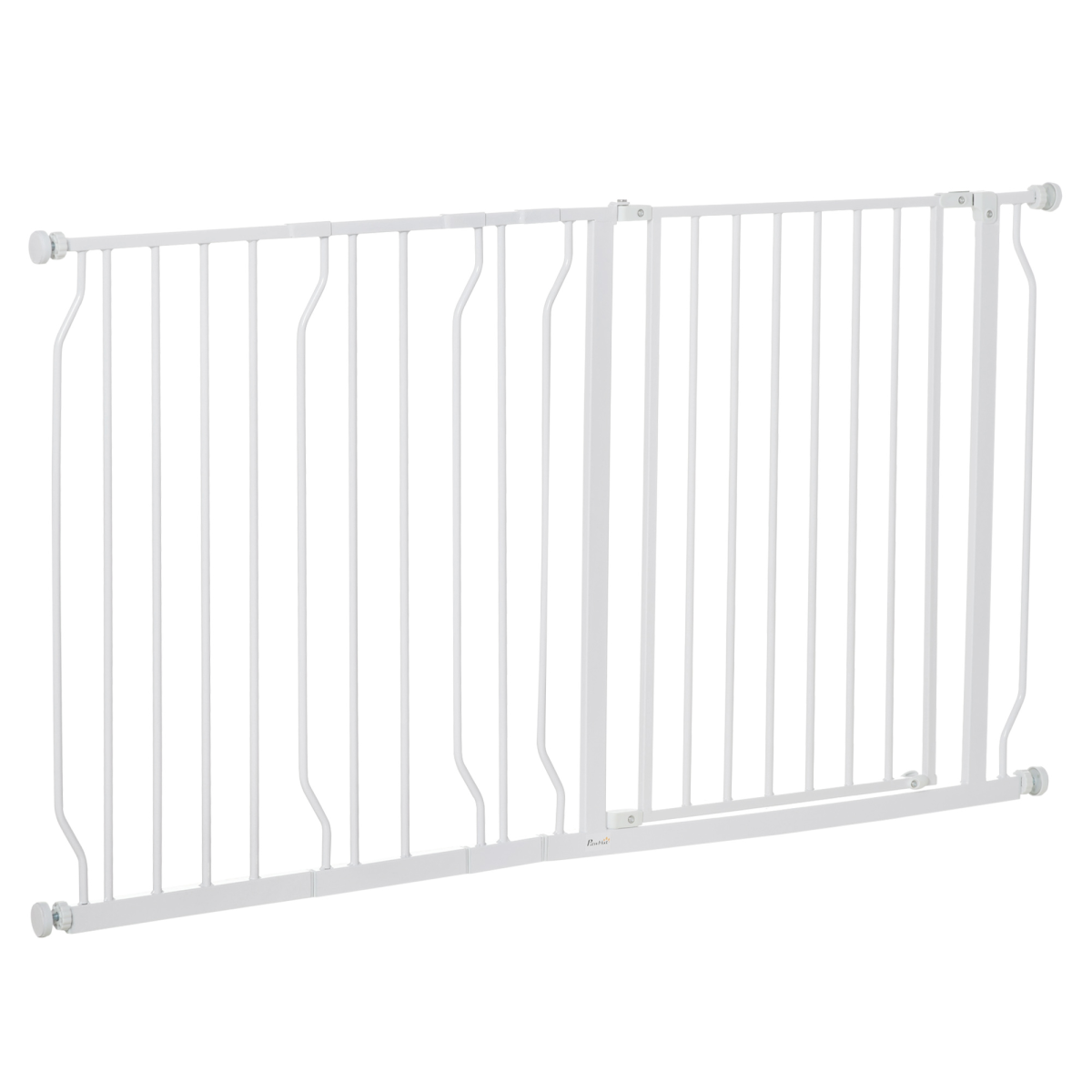 75-145cm adjustable width: Pet gate is suitable for different sized openings you can block different areas in your home.Double-locking system: Open the dog gate with one hand by pressing and lifting the button. A lock block at the bottom for added stability.Durable material: Made from sturdy steel, this puppy gate is strong and stays firmly upright when in use.Easy access: Opens in both directions to easily get through. Suitable for doorways, hallways and staircases.Dimensions: 76H x 75-145Wcm. Suitable for openings of 75-145cm. Please measure your opening before purchasing. Assembly required.