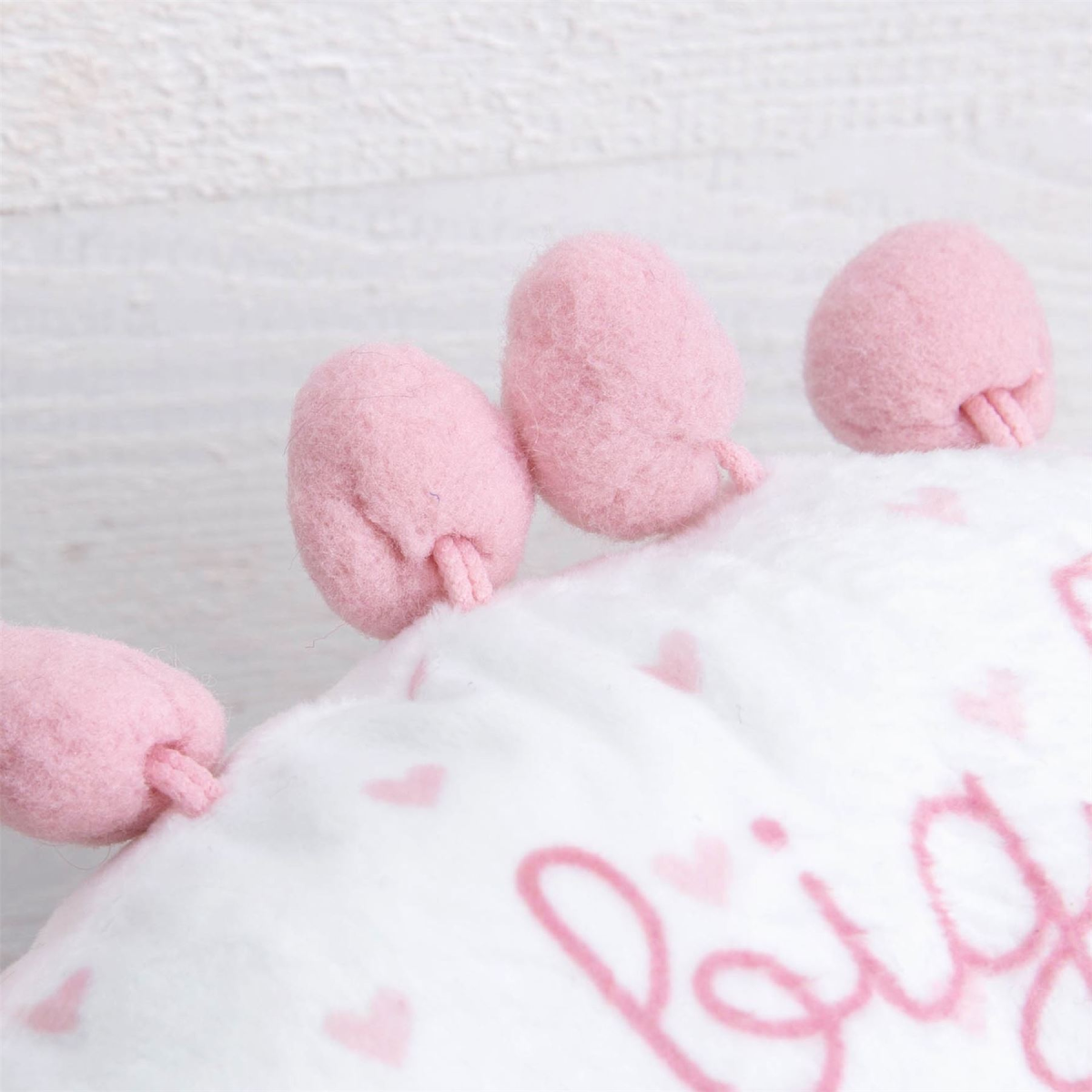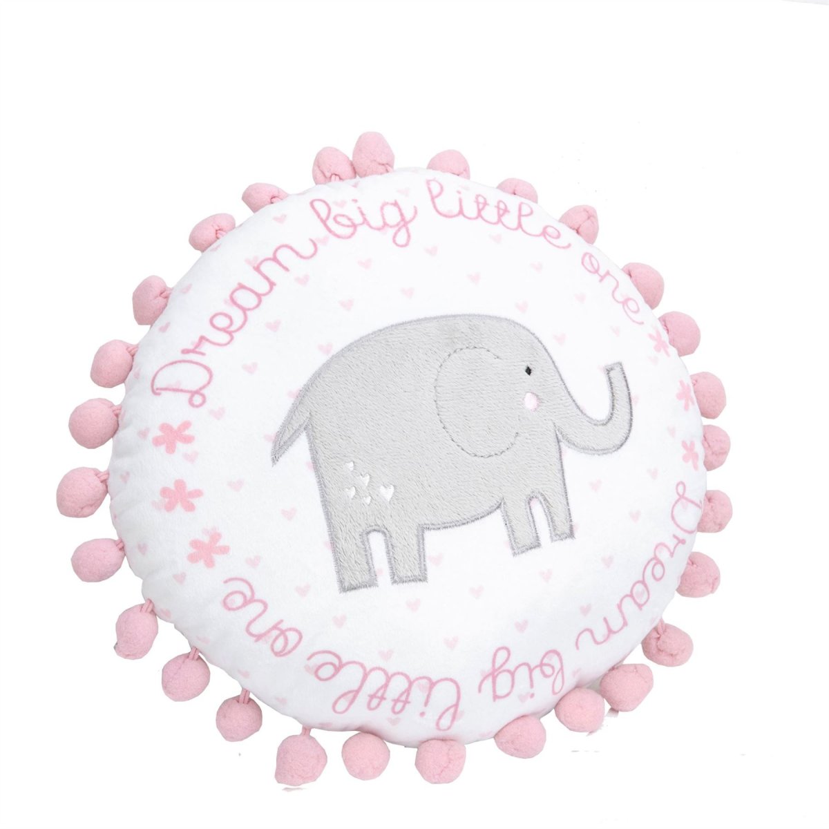 This super soft 30cm fabric cushion features a cute grey elephant design with soft pink border lettering and pink bobbly trim around the edge.