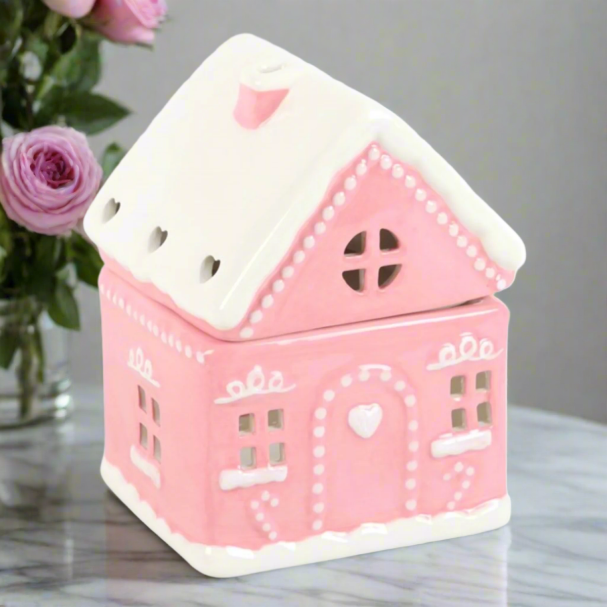 This charming candy-pink gingerbread-style oil burner is a delightful way to add warmth and fragrance to any room. Designed with intricate snow-frosting accents and a pastel, cookie-inspired finish, it offers both function and decoration. Simply remove the lid to add your chosen festive or everyday scents, place a lit tealight inside, and enjoy the gentle, welcoming glow through its windows and openings.