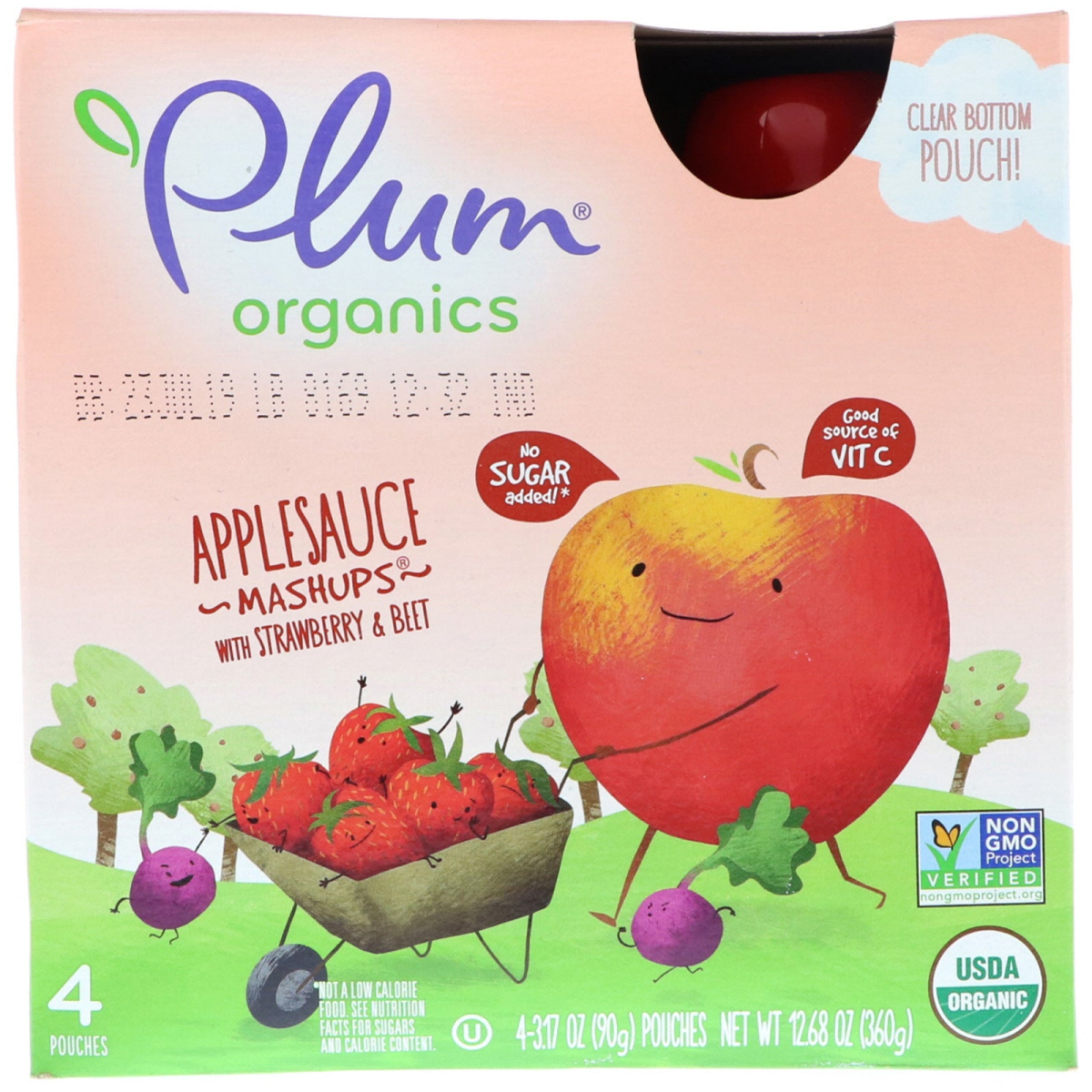 Clear Bottom Pouch! No Sugar Added!* Good Source of Vit C Non GMO Project Verified Kosher USDA Certified B Corporation Certified by Oregon Tilth Feed Amazing Using Business as a Force for Good Squeeze the Most out of Snack Time! A kid-pleasing blend of applesauce punched up with nutritious fruits and veggies. It's a delicious way to fuel up without the added sugar. No Sugar Added* or Juice Concentrates Good source of Vitamin C Does matter? We think so, especially since many fruits and veggies test significantly lower for pesticide residue when compared to non- fruits and veggies. Plus, no GMOs allowed! Plum believes every little one deserves to be nourished to her full potential. *Not a low calorie food. See nutrition facts for sugars and calorie contest.