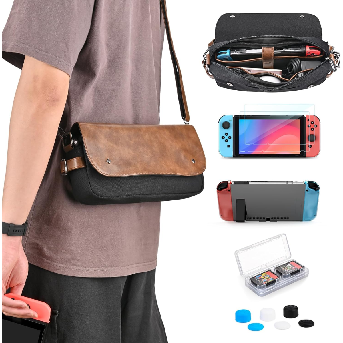 - 14-in-1 Switch Case Accessories: Includes a switch carrying case, console and J-CON covers, 2 screen protectors, 6 thumb grips caps, 1 adjustable shoulder strap, and a game card case