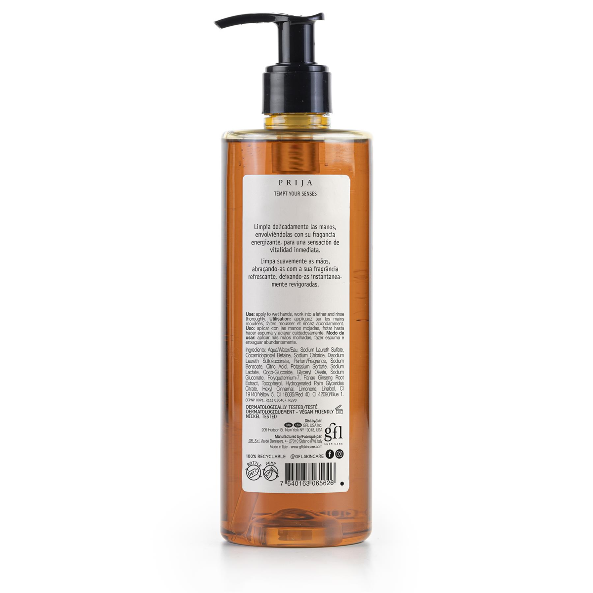 Liquid hand soap with Ginseng for daily hygiene. Gently cleanses the hands, with the enveloping fragrance of Prija, for an immediate sensation of vitality and well-being. Enriched with Ginseng extract. The invigorating properties of the Ginseng plant have been known in the East for many centuries. Extracts from its roots have invigorating and revitalising properties on the skin. An enveloping fragrance that combines strength and character with a warm and relaxing atmosphere.