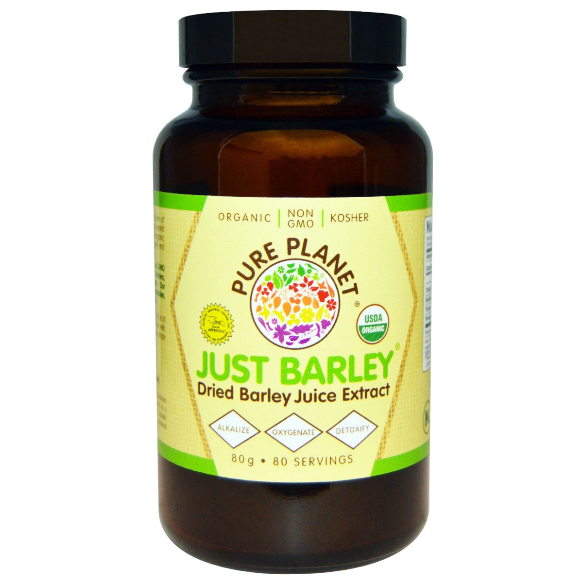Non GMO Kosher USDA Diabetes Resource Center Inc, Setting the Standards-"Seal of Approval" Dried Barley Juice Extract Alkalize Oxygentate Detoxify 80 Servings Certified 100% by Quality Assurance International Just Barley is perhaps the purest form of green food nutrition available in the world today. This 100% pure, raw, certified superfood helps alkalize, oxygenate and detoxify your body. Just Barley has been awarded the Diabetes Resource Center's "Seal of Approval" as a safe and beneficial food for diabetic consumption.