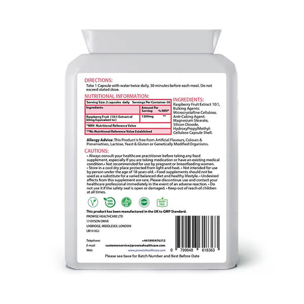 Raspberry Fruit Extract 1200mg - 60 Capsules x 2 Pack - UK Manufactured | GMP Standards by Prowise Healthcare