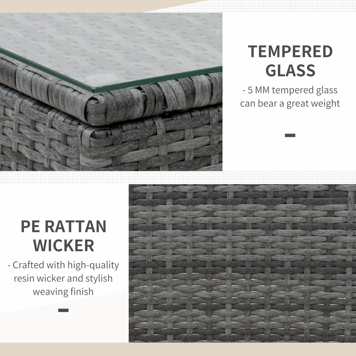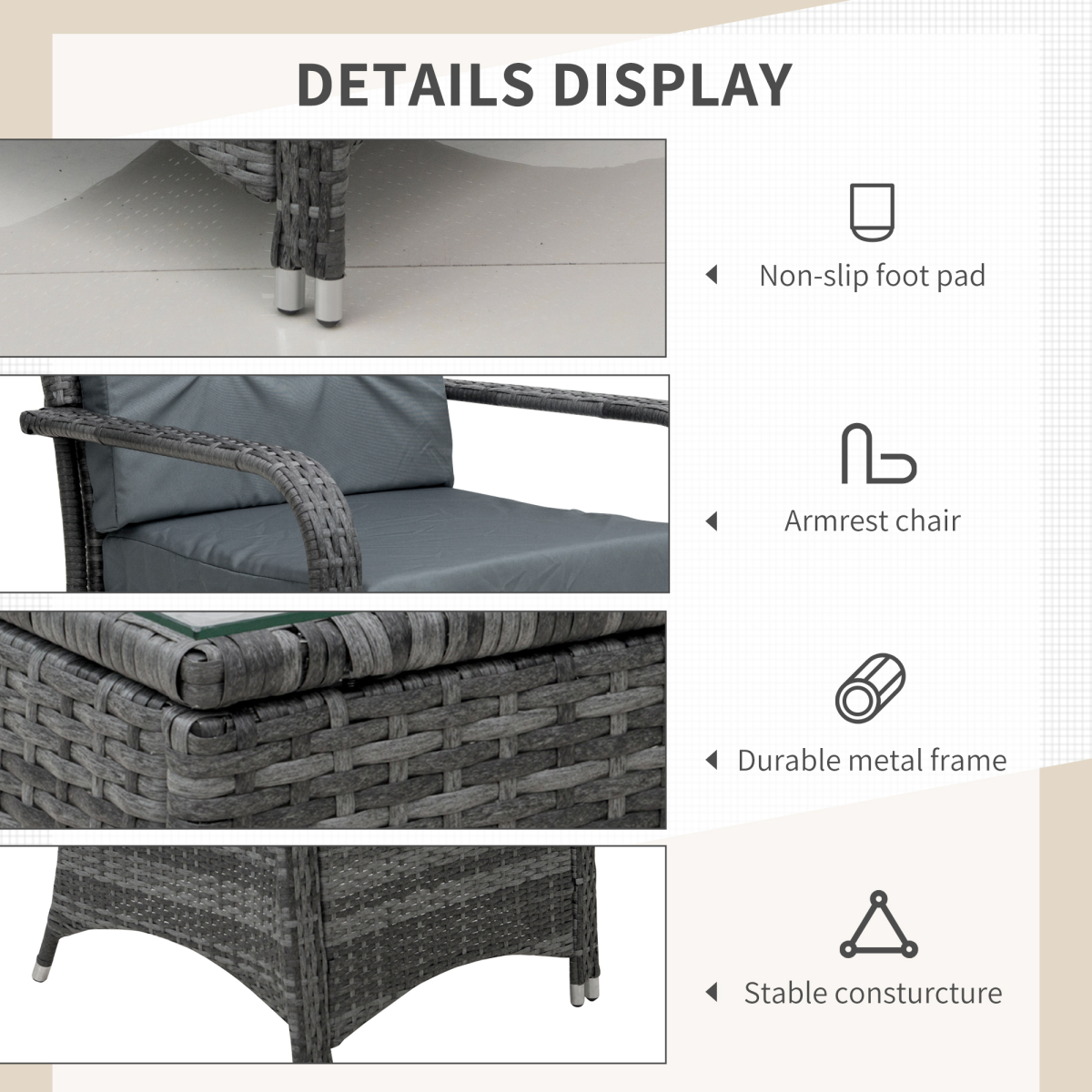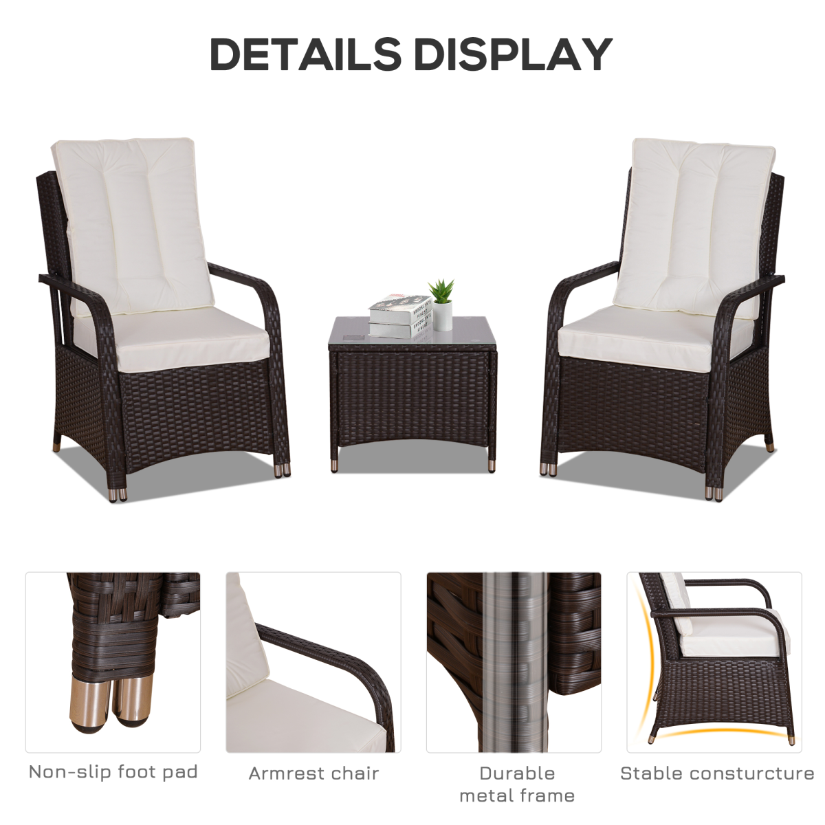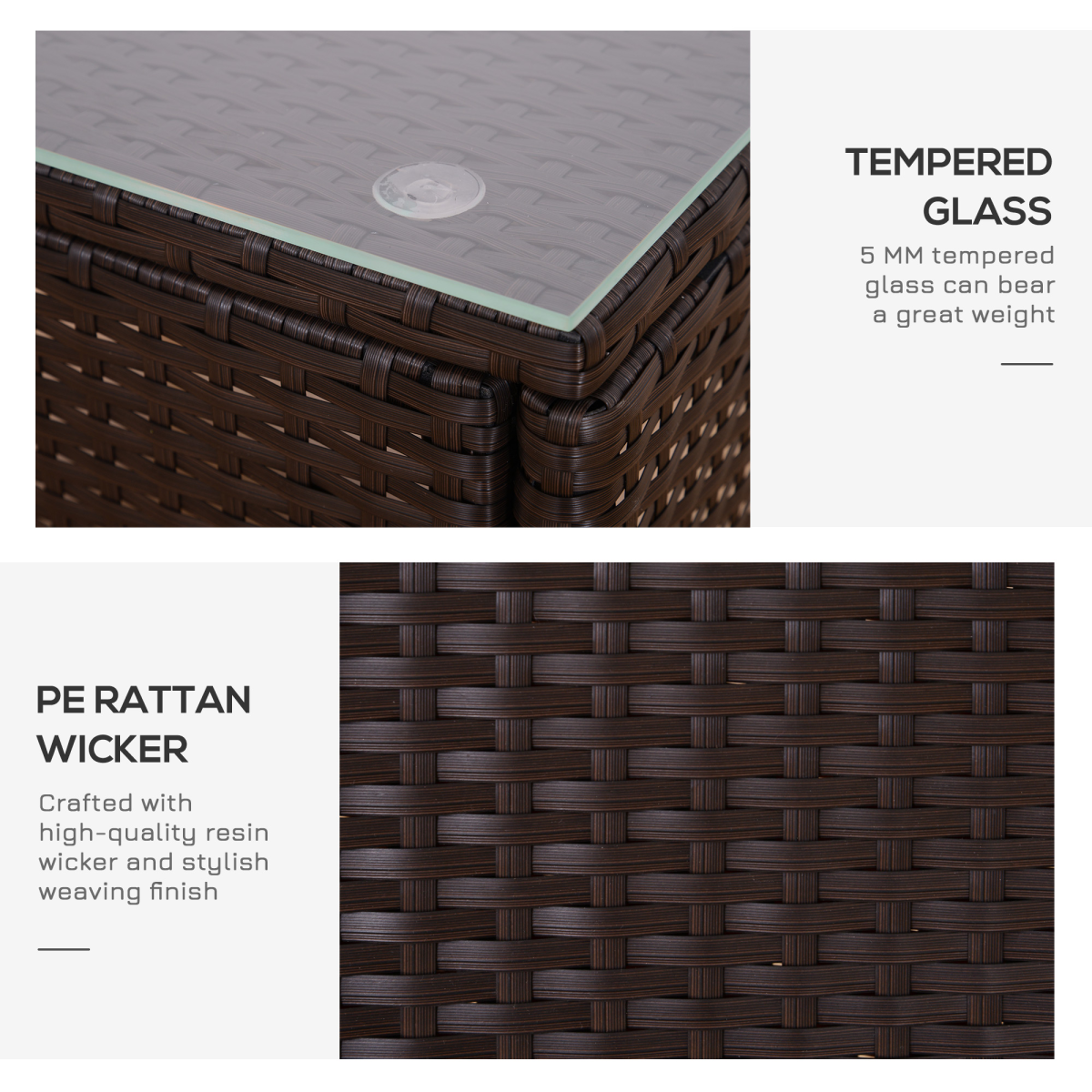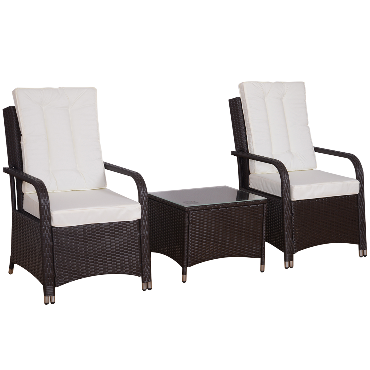 This outdoor bistro set made of PE Rattan is an ideal choice for your garden, patio or balcony. Combined with steel frame structure and covered with rattan, this set is the optimal set to have. Comes with two seats with cushions and a table with a glass top to place drinks and magazines. The stylish modern design can fit into any style of your home and garden.