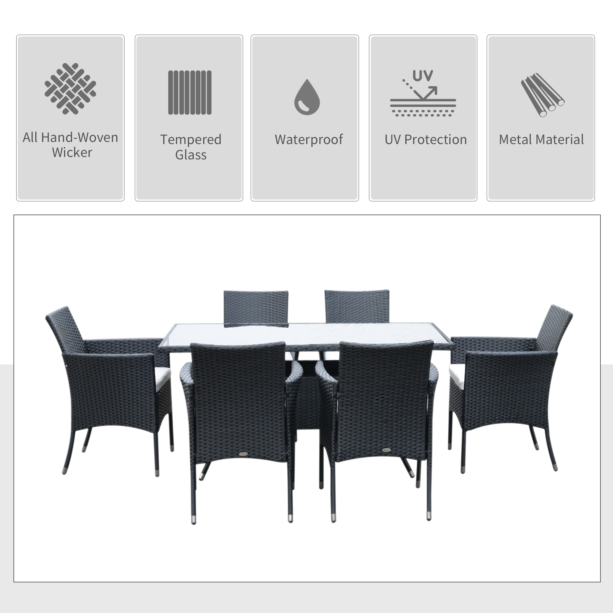 This deluxe 7piece rattan dining set is a great addition to patio or garden, made with high quality PE rattan and durable steel construction for sturdiness and long lasting. It also comes complete with a 5mm thick tempered glass for the table top, so you can use on a daily basis. It's easy to maintain and keep clean using a damp cloth.