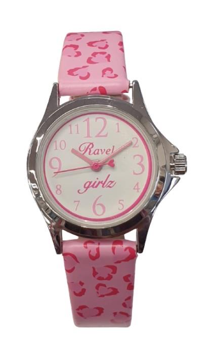 New Ravel Girlz eye-catching pink hearts watch.Fantastic detailed watch with easy to read dial makes this a great child's first watch.Built to take all the knocks and bangs expected of a children's watch and fully adjustable strap to fit all wrist sizes. Package Dimensions  :  22.4 x 5.4 x 0.1 cm; 80 Grams