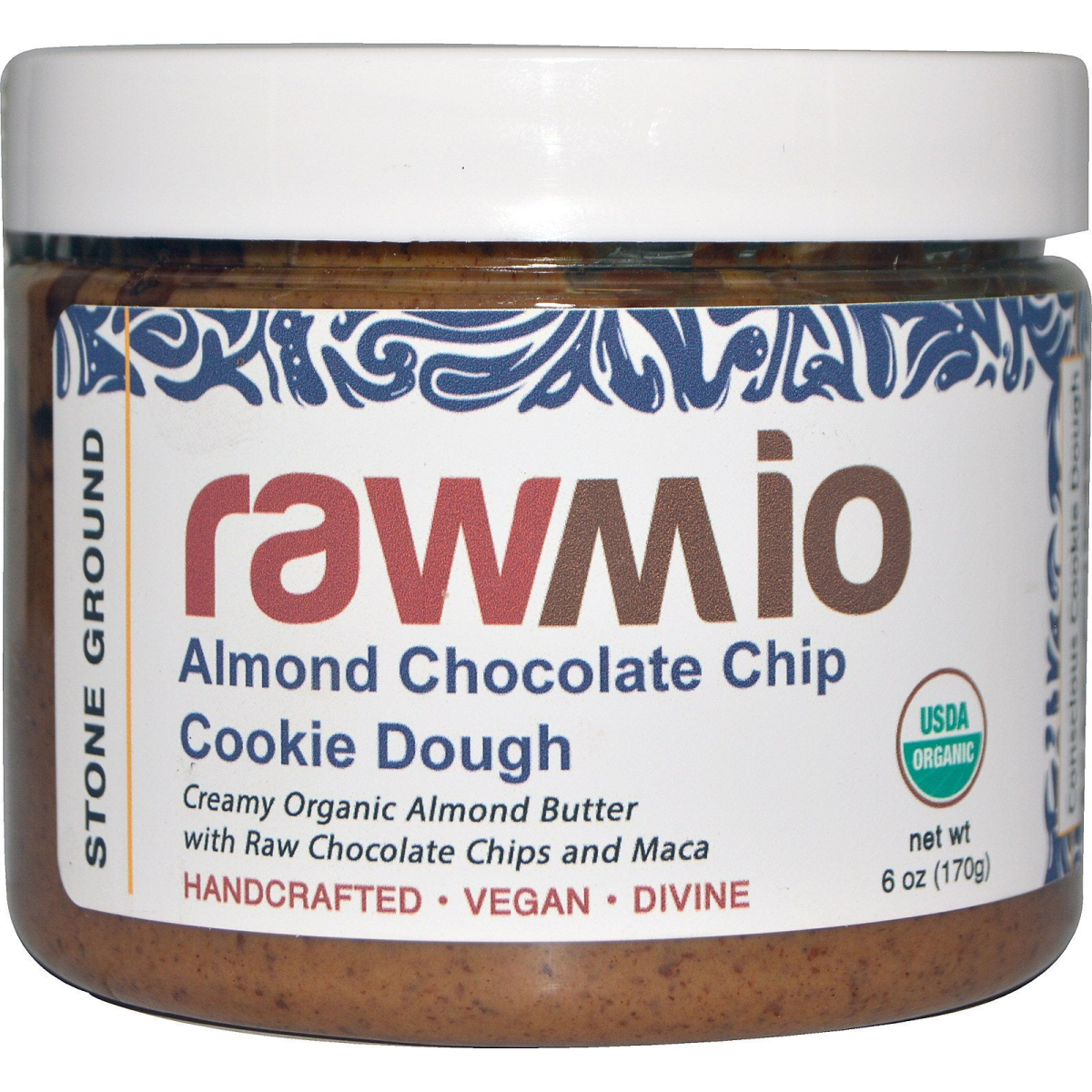 Stone Ground Creamy Organic Almond Butter Handcrafted Vegan Divine USDA Organic Conscious Cookie Dough Certified Organic by Oregon Tilth We've taken the ultimate comfort food: chocolate chip cookie dough, and turned it into the most decadent yet healthful spread imaginable. Raw chocolate chips are immersed in a silky blend of stone ground raw almonds, coconut sugar, vanilla bean, Himalayan salt and energy-boosting maca powder. Spread the love!