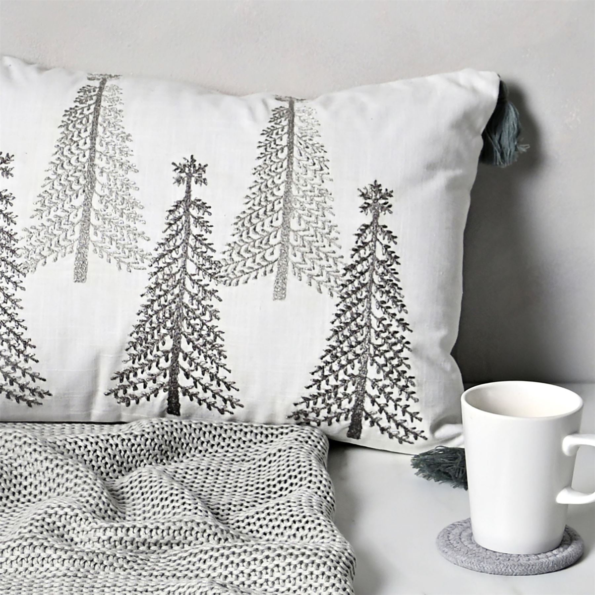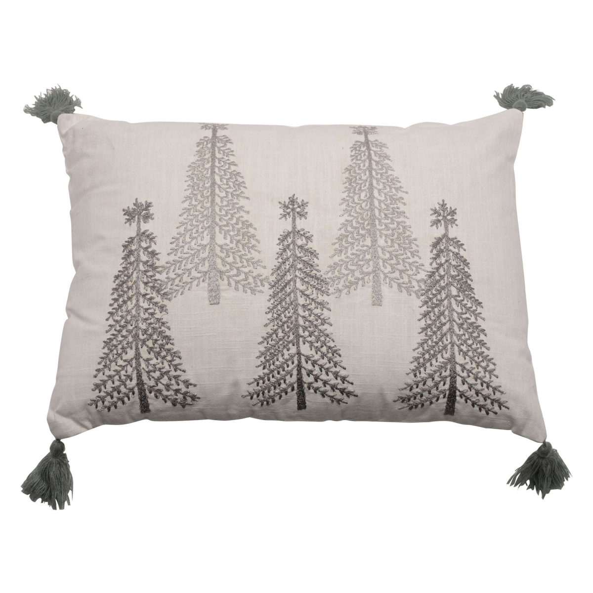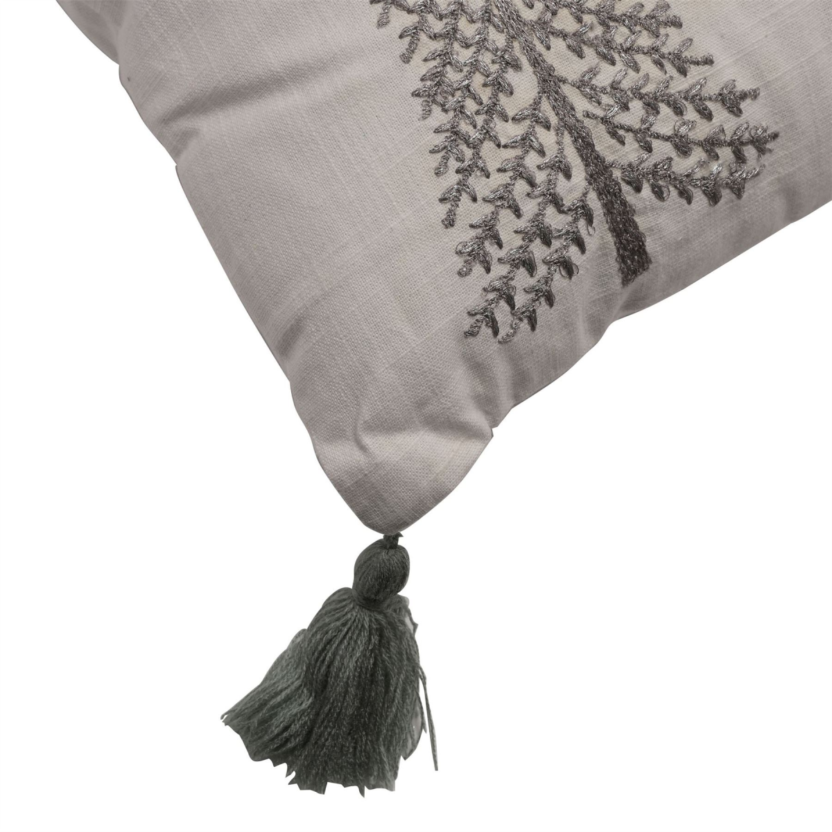 The rectangular, white fabric cushion showcases a gorgeous silver embroidered Christmas tree design. It is finished by silver-grey fabric tassels on each corner.