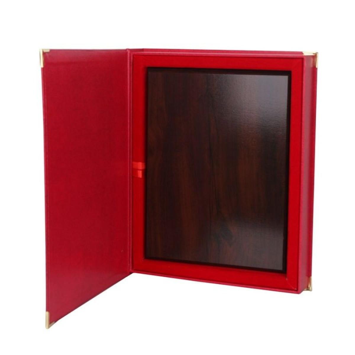 Red wooden backing case. Available in four colors: red, blue, green, and brown. Four sizes: 30.5 x 23 cm, 25.5 x 20 cm, 23 x 18 cm, and 20 x 15 cm. Metal elements reinforce the corners, adding a decorative touch. The interior is lined with soft velvet matching the backing, and a ribbon attached to the backing makes it easy to remove. The case can be presented with a plaque in either a vertical or horizontal format. Ideal for anniversaries, thank-yous, certificates, awards, and more. We create color sublimation plaques on wooden backing. For design inquiries, please contact our plaque department.