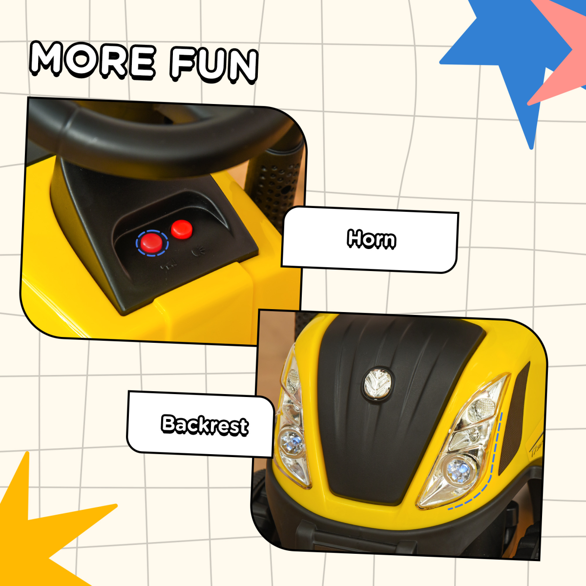 FUN FEATURES: A horn and headlights for extra interaction. Back box for storage. Included fork and shovel for sand.