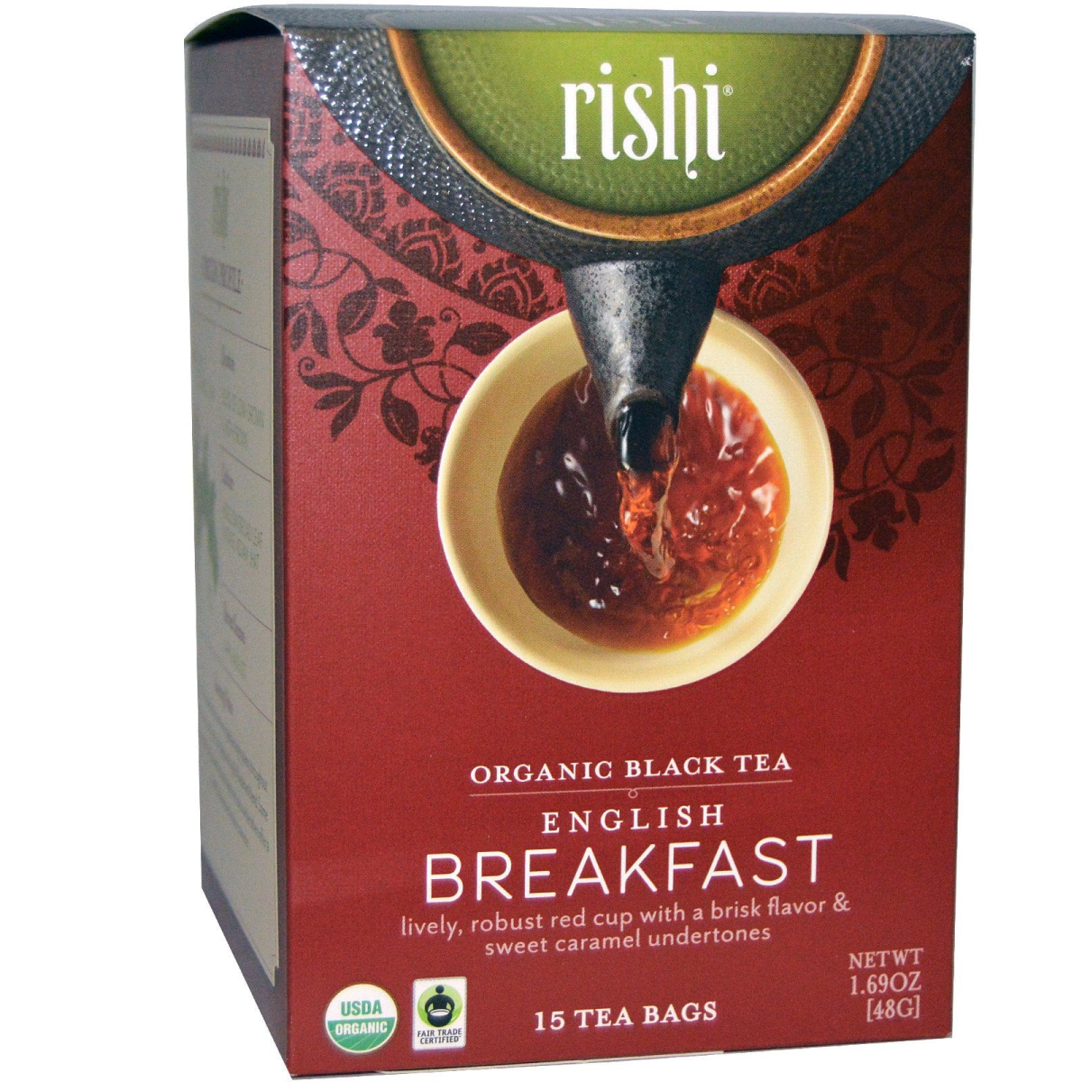 Lively, Robust Red Cup with a Brisk Flavor & Sweet Caramel Undertones Fair Trade Certified USDA Non-GMO Certified by QAI, inc. Certified Kosher Caffeine Level: High Flavor Story What makes a great "breakfast tea"? Our blending team has spent years tasting and studying black tea bush cultivars that offer a truly robust character, bright red cup color and inviting aromatics. Our English breakfast is full-bodied, brisk and malty with a nuanced caramel sweetness. Perfectly balanced on its own or gratifying when smoothed out to your taste with milk or sugar. Taste True Tea We are driven by a mission to connect tea drinkers to the origins of our teas. For us, that is the essence of being a direct trade importer. Rishi’s tea buyers travel the world every year, collaborating with artisan tea farmers during the peak growing seasons. This allows us to source teas and botanicals of an epicurean caliber, infusing everything we create with a signature quality and story. In that adventurous spirit, we invite you to Taste True Tea. Fuller Flavor, Deeper Aroma, Richer Body Introducing Our Novel Knit Tea Bag Unlike common paper tea bags-which strip away the flavor and aroma of tea-the Rishi tea bag features a novel knit material designed to provide a truer infusion of our teas and herbal ingredients. The result is an incredibly aromatic, full-bodied cup that tastes just as rich as loose leaf tea. Origin Profile OriginSouth & Southeast Asia, Imported Black Tea ElevationBlend of Low-Grown & High-Grown CultivarHeirloom Broad Leaf Vintage Assam JHAT Harvest SeasonApril-August Sourcing Notes: Each year we taste black teas from multiple origin points throughout Southeast Asia to form our signature English Breakfast tea blend. Some origins offer fruity sweetness and bright red color while others offer a refined briskness and character.