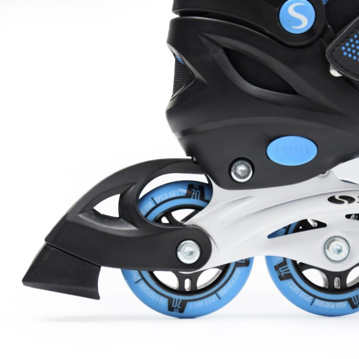 - wheels: PU 70 mm, hardness 82A · bearings: ABEC-7 · brake: TPR · fastening system: lacing + AUTO LOCK buckle + velcro · roller skid made of aluminum · brake on the right roller