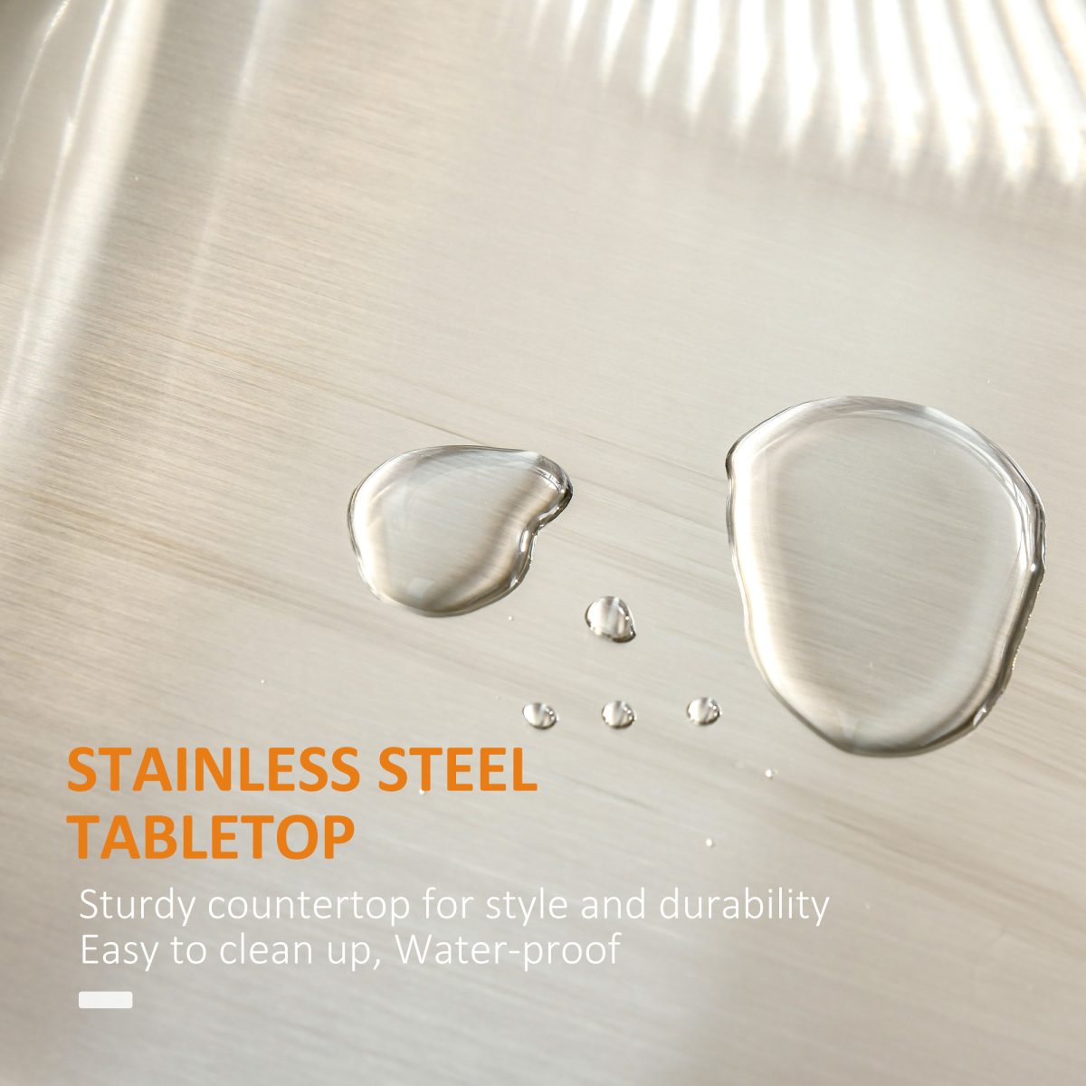 Multi-storage: This movable kitchen island features a large drawer, bottom cabinet, towel rail, knife rack, spice rack and a stainless steel work top.Sturdy: MDF structure is durable, with stainless steel countertop for a safe and supportive place to prepare food. Metal is easy to clean after.Four wheels: Easy to move around, whether you're in the kitchen, dining room and lounge areas. Two are lockable to stand still when required.Cupboard with adjustable shelf: A handy place to keep boxes, jars, tins and more stored. Adjustable shelf for added convenience.Dimensions: 83.5W x 45.7D x 90.5Hcm. Assembly Required.