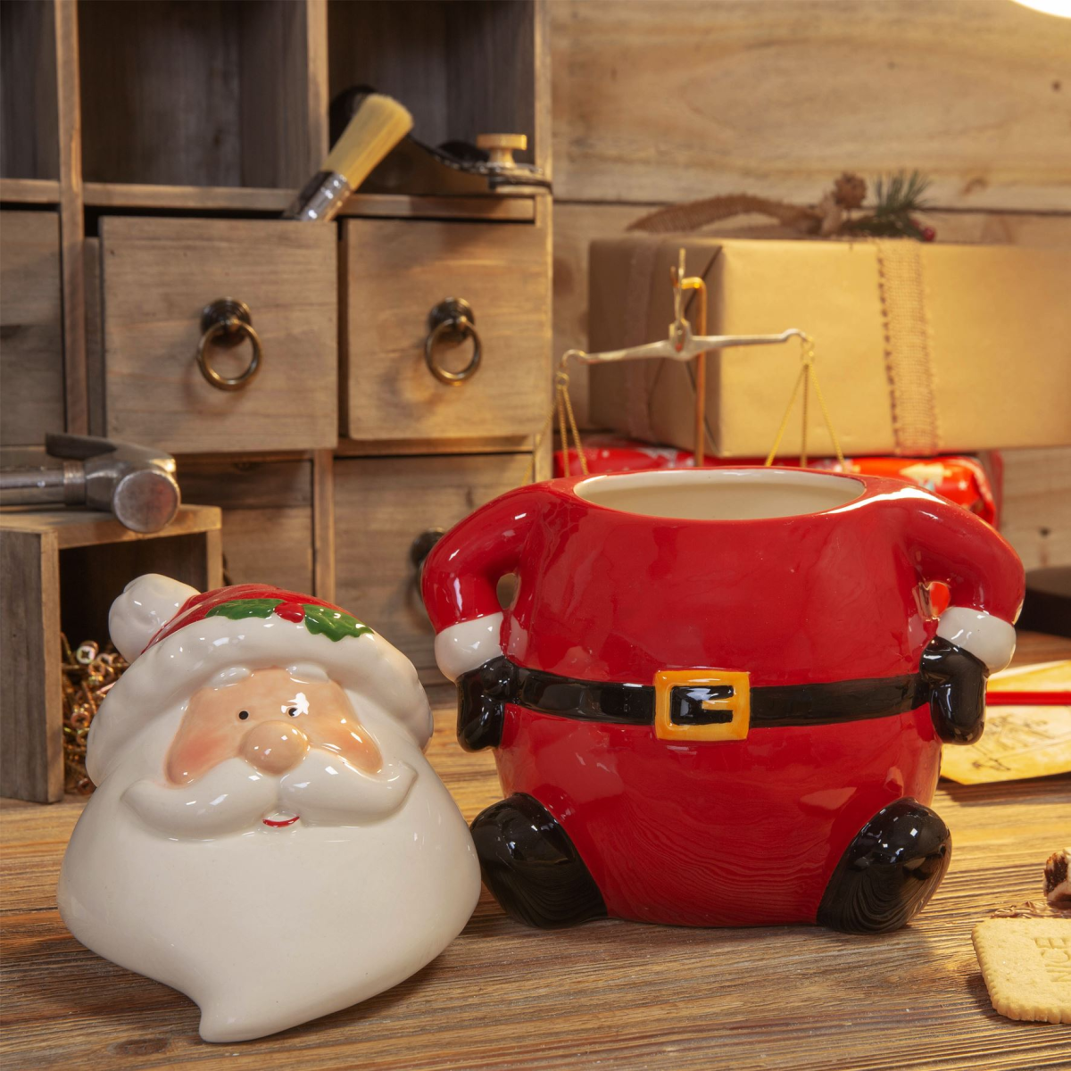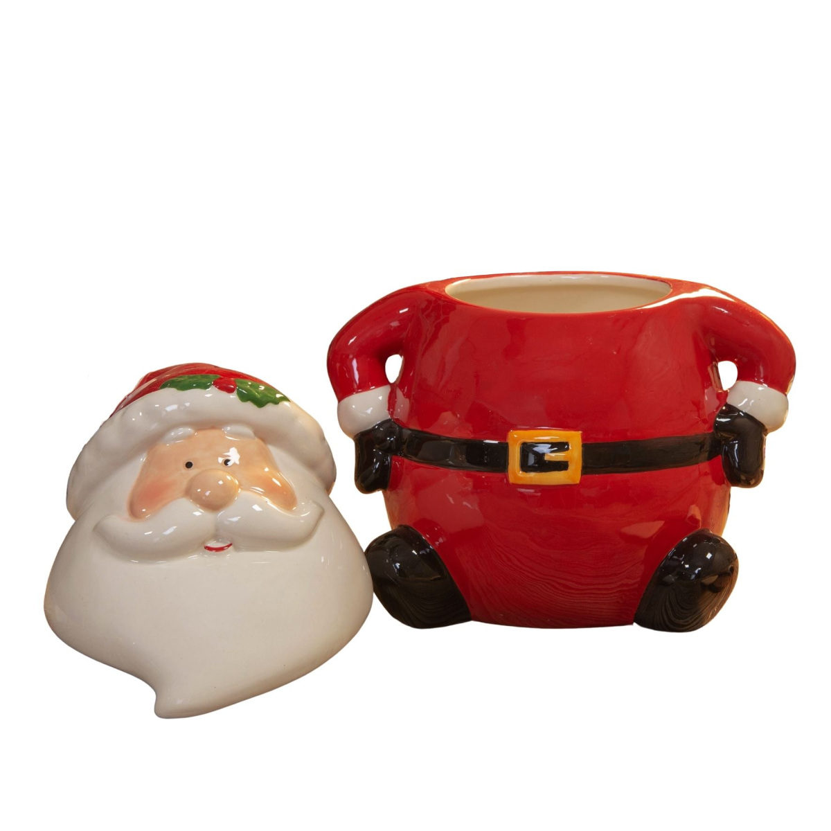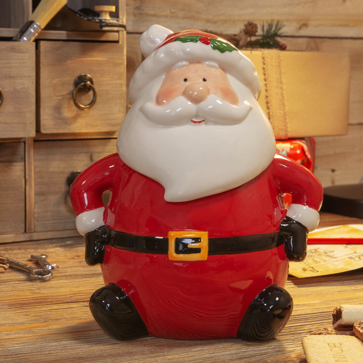 Store Christmas cookies, cakes or mince pies in festive style with this hand painted earthenware ceramic lidded cookie jar. From the North Pole Novelties Co. by Santa's Workshop - the one stop shop for Christmas cheer!