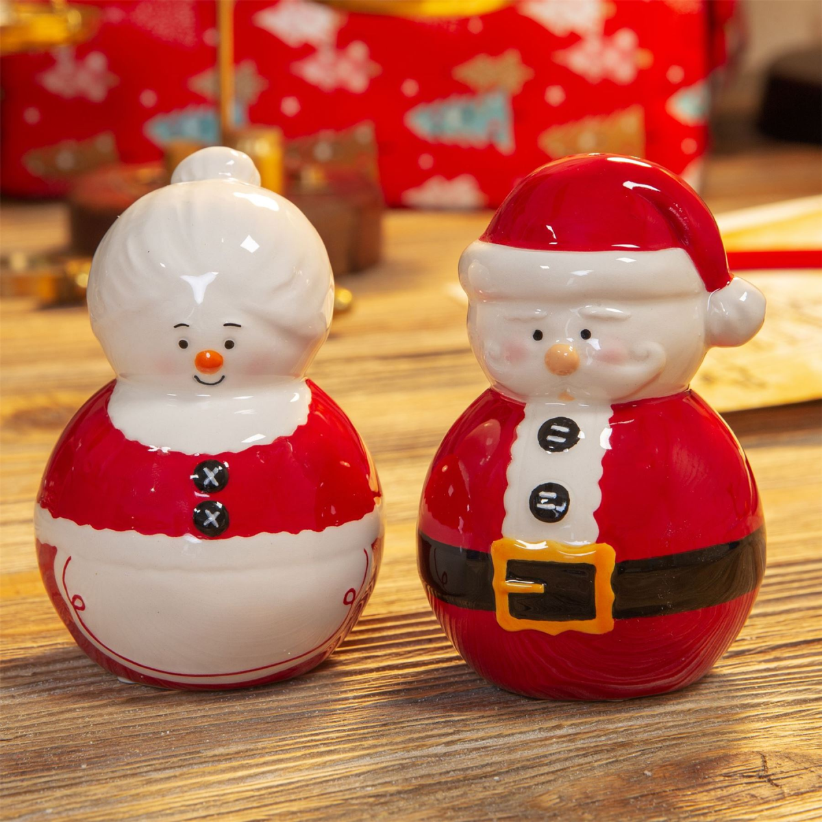 Bring some extra festive cheer to the Christmas dinner table with these hand painted ceramic Santa & Mrs Claus salt & pepper shakers. From the North Pole Novelties Co. by Santa's Workshop - the one stop shop for Christmas cheer!