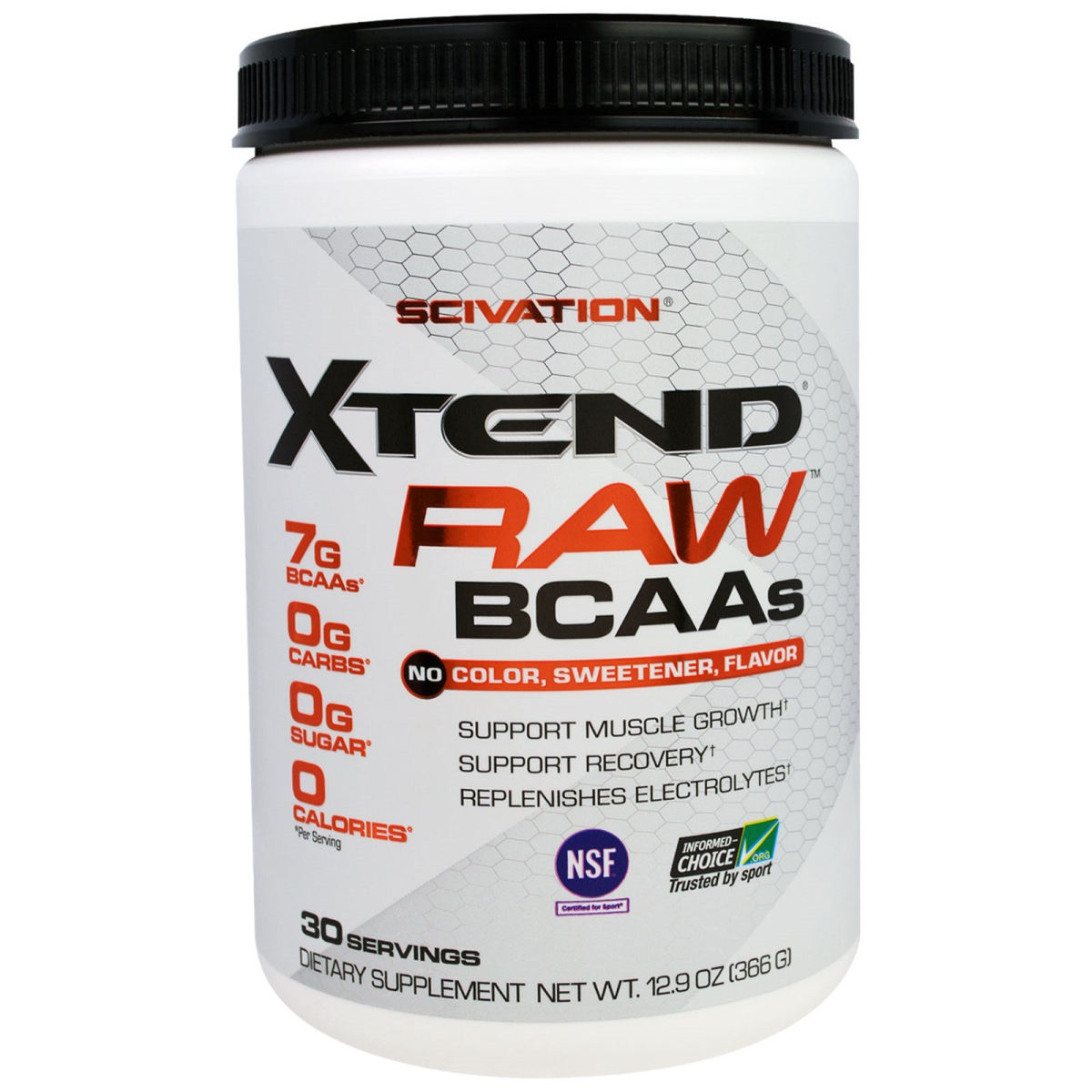 7 g BCAAs* 0 g Carbs* 0 g Sugar 0 Calories* 30 Serving No Colors, Sweetener, Flavor Support Muscle Growth Support Recovery Replenishes Electrolytes NSF Certified fo Sport Informed-Choice Trusted by Sport Dietary Supplement Product Produced in a GMP-Certified Facility Scivation XTEND RAW contains the same trusted and university-tested Scivation XTEND formula, but without flavor, color or sweetener - just XTEND in the RAW making it the most versatile BCAA product of its kind. Add a scoop of Scivation XTEND RAW into your favorite protein shaker or smoothie for an added BCAA boost, or drop an additional scoop into your existing Scivation XTEND to help you train and perform at your best. Use Scivation XTEND RAW with 7 g of 2:1:1 BCAAs, Citrulline Malate, Glutamine, and hydration-promoting Electrolytes to get the most of your next workout. *Per Serving