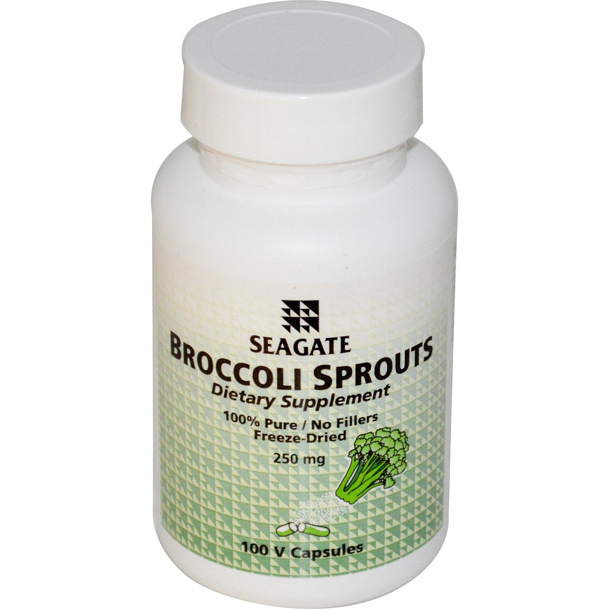Dietary Supplement 100% Pure/ No Fillers Freeze-Dried Raw Material Source: Seagate grows their broccoli sprouts on their own farm, Seagate has complete control over this project, from planting and growing, to freeze-drying the finished product into a fine powder. Convenience: This product represents a 20:1 concentration of the original plant, one 250 mg capsule of dried powder equals 5 grams of the raw vegetable before freeze-drying. Broccoli is a food that everyone knows that they should eat, but many avoid. Seagate provides the benefits of eating raw broccoli without the need to shop, refrigerate, cook, prepare, or even taste it.