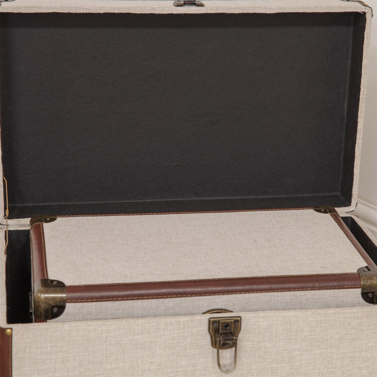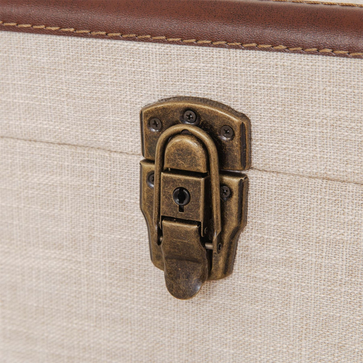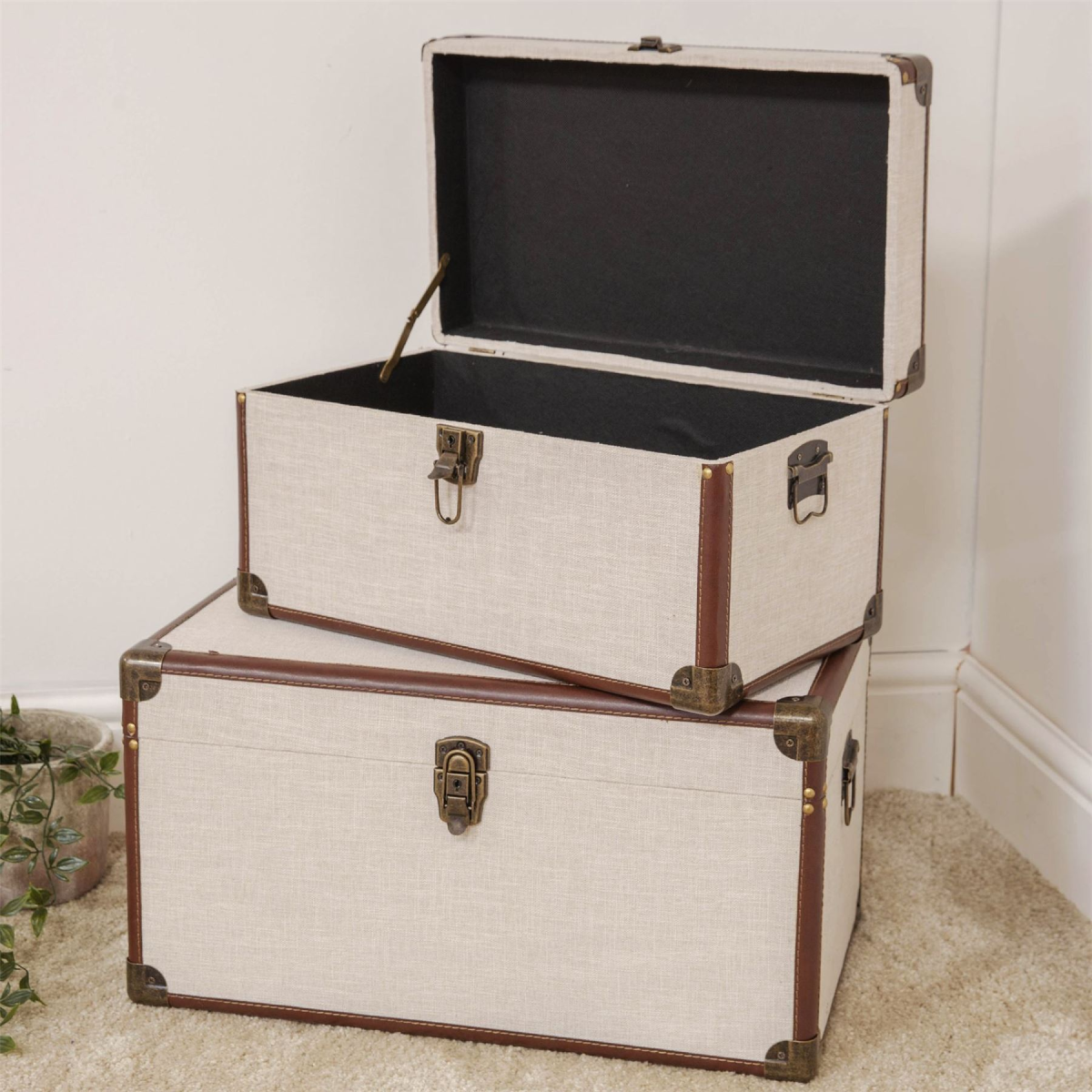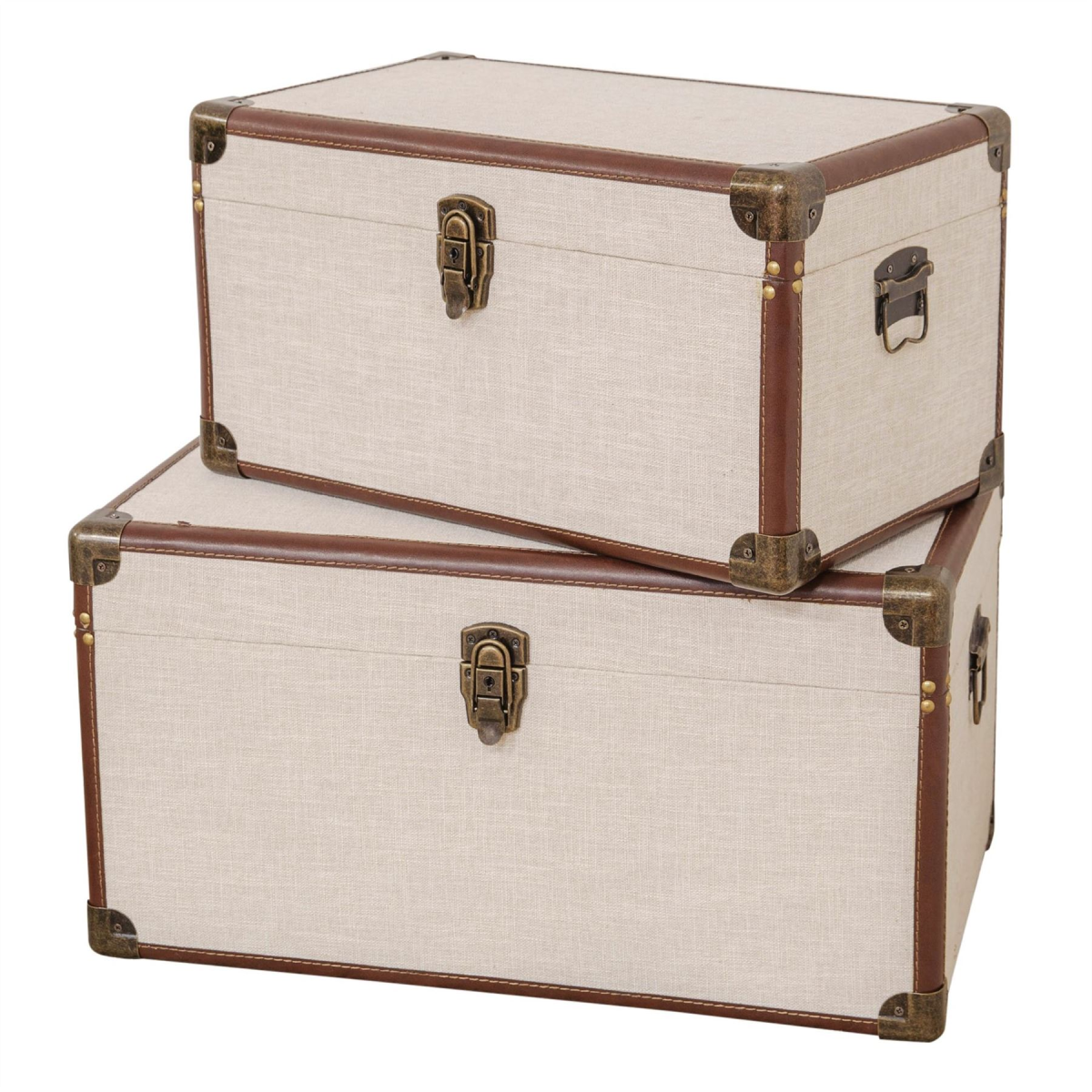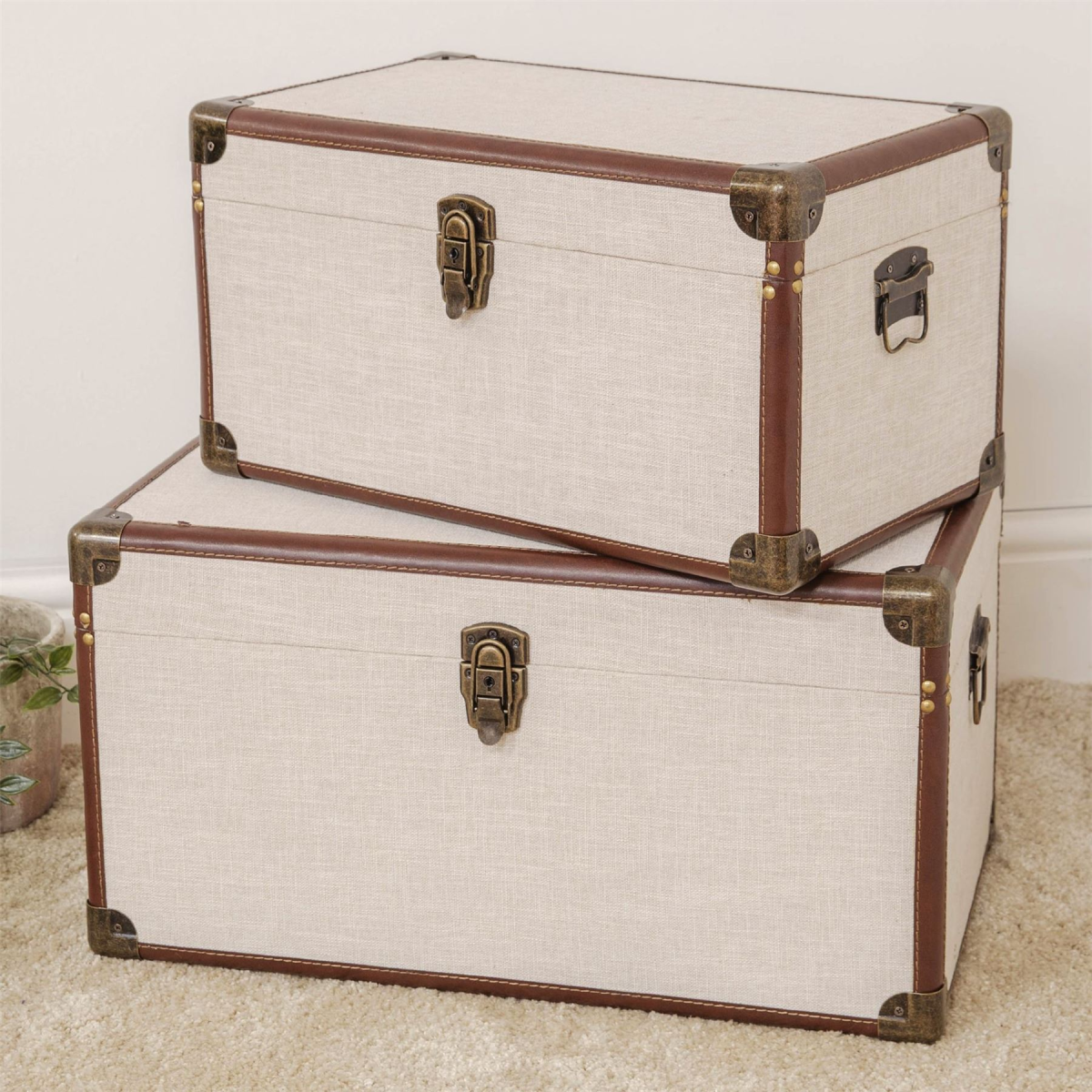 A stylish and contemporary set of 2 cream linen and brown leatherette storage chests. From the Refined Glamour collection by HESTIA� - a perfect fusion of Art Deco radiance and that signature HESTIA� elegance.